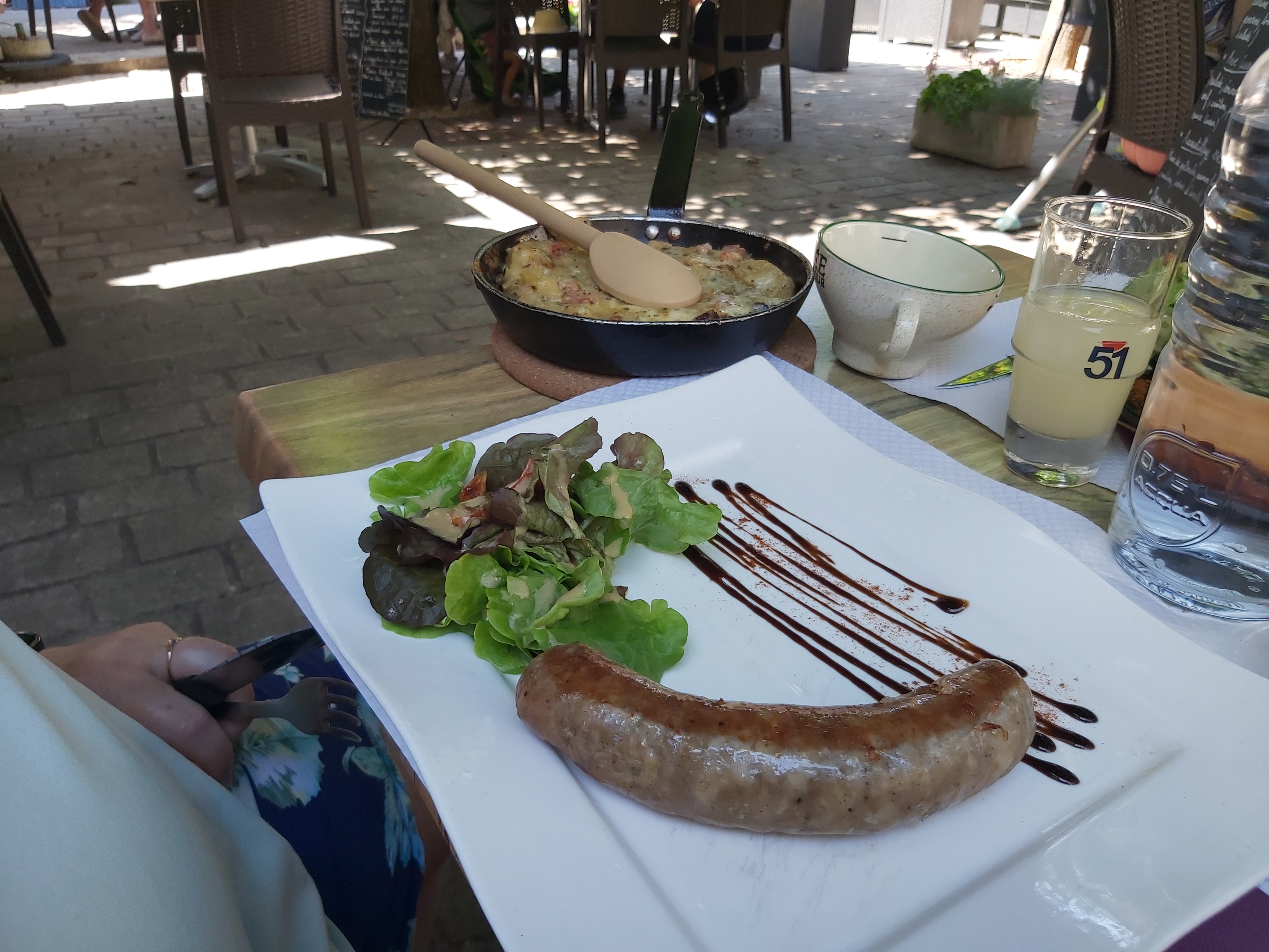 Avant toute chose ne pas tenir compte de l’avis négatif, la dame devait être dans un bad trip. Accueil charmant, souriant, équipe très sympa et pro. Service rapide alors que le restaurant était plein. Bel endroit sous les arbres dans ce magnifique village mais surtout une excellente cuisine, je recommande le cochon en effiloché, sauce excellente. Foie gras en entrée très bon . Nous n’avons pas pu prendre de desserts après ces excellents et copieux plats. Une halte excellente je recommande vivement, impossible d’être déçus! Signé : la personne qui a reconnu avec quels ingrédients était faite la moutarde 😃