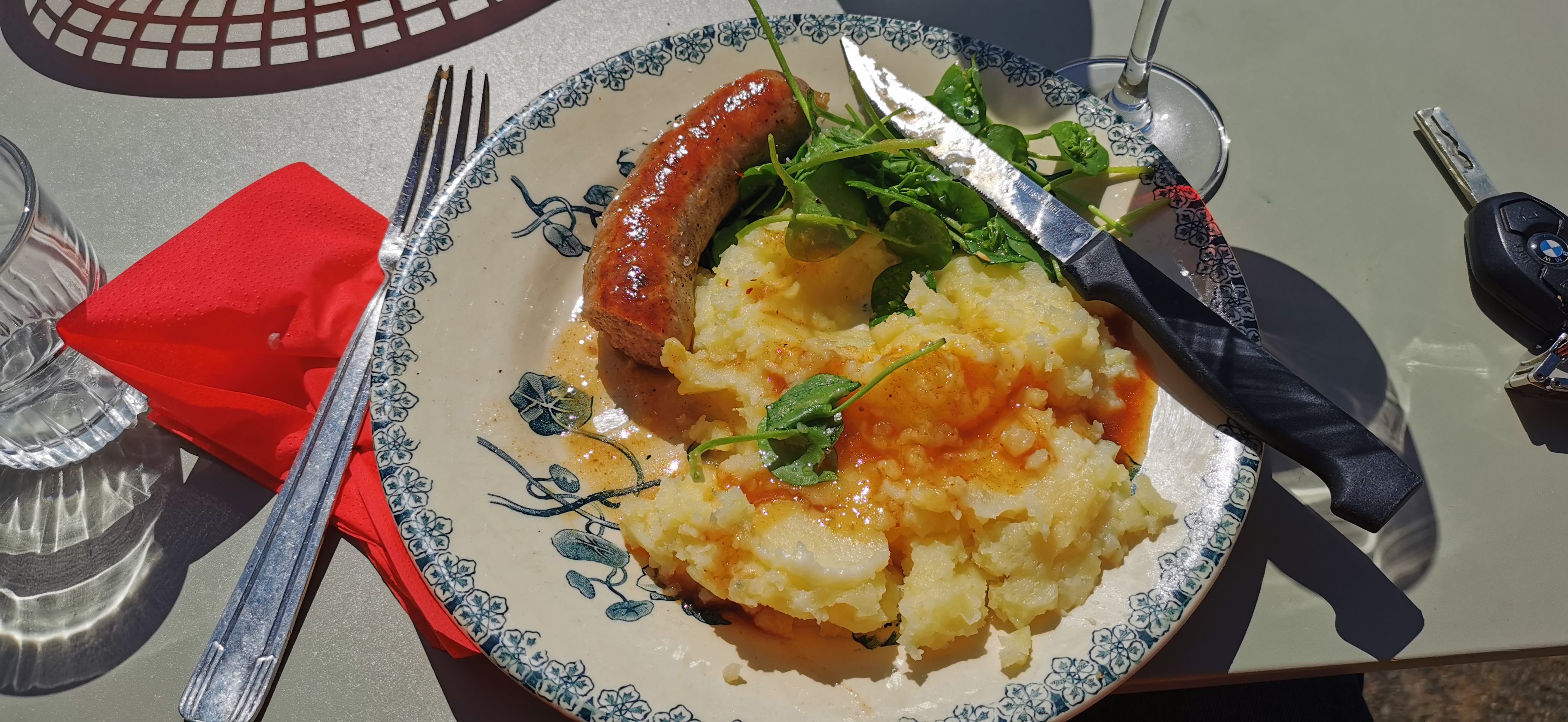 Passez votre route avec une saucisse purée à 17 euro 2 entrée au choix un service minable 45 minutes d' attente a 4 personnes dont 1 enfant 108 Euro inacceptable pas de viande pas de poisson une table très sale un intérieur abandonné des toilettes sans entretien rapport qualité prix sans aucun choix inadmissible extérieur a l abandon c est une cantine avec serviettes en papier sale plutôt une grosse arnaque a éviter