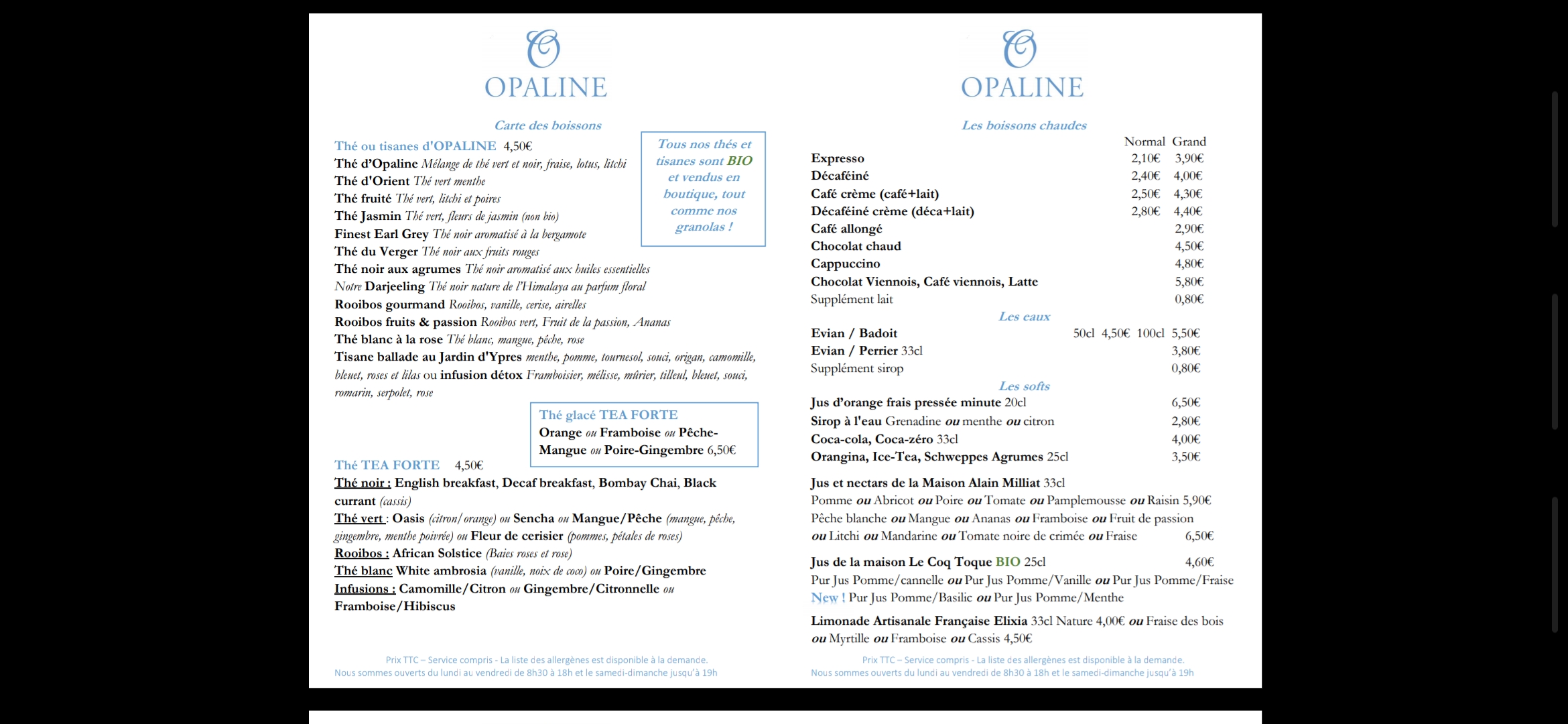 Moment très agréable passé chez Opaline. Les pâtisseries sont délicieuses. Mention spéciale à notre serveuse au petit accent British qui s’est très bien occupé de nous et a su nous conseiller. Très serviable et souriante. Nous reviendrons lors de notre prochain séjour.