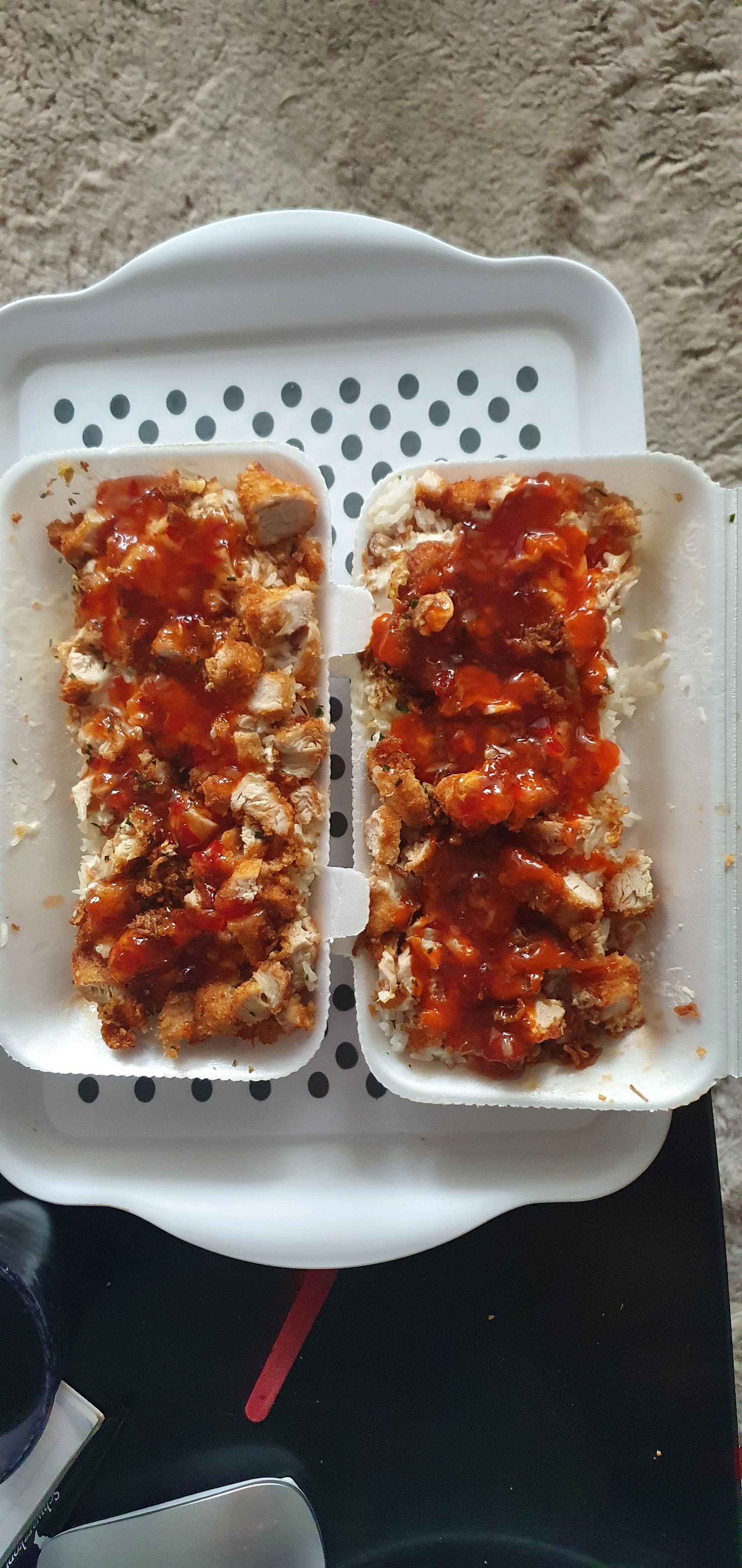 Trop de riz et le poulet était un peu dur. La sauce était très à l'ail. Délais de livraison acceptables (30 minutes) et nourriture acceptable en cas d'urgence sur autoroute