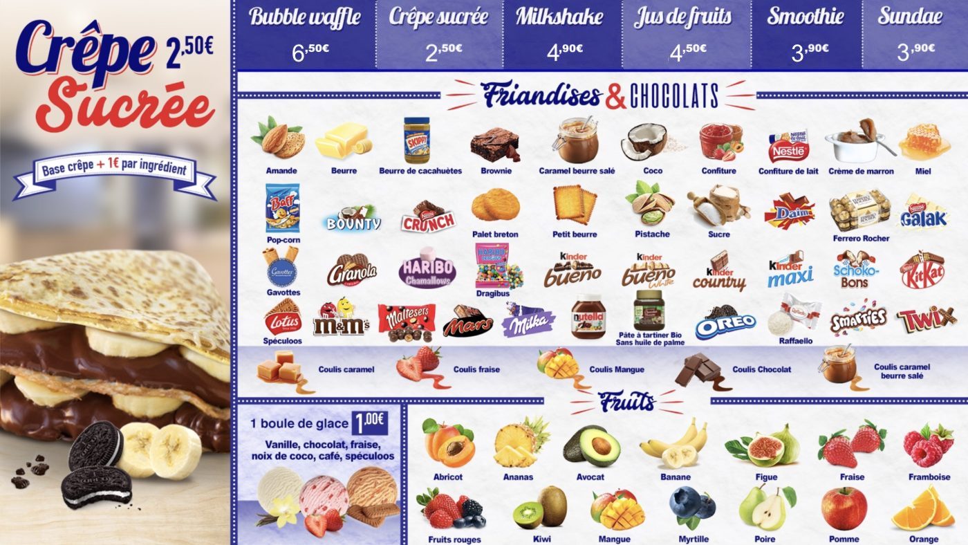 Belle découverte, beaucoup de choix pour les crêpes sucrés, dommage que les bubble waffle n’était pas dispo mais un bon rapport qualité prix les oreo et le chocolat était bien généreux sur ma crêpe je reviendrai