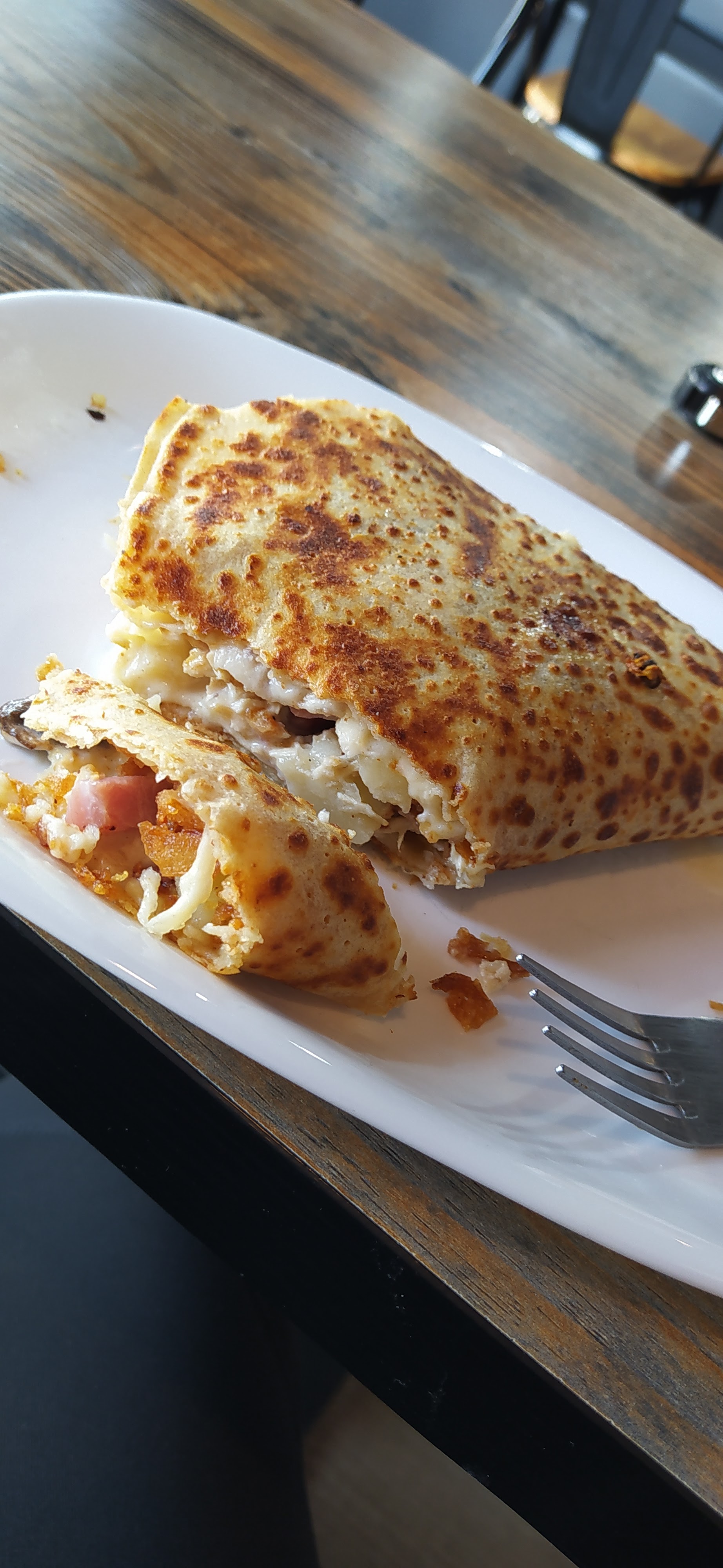 Manger une crêpe doit être un plaisir, peu importe l'heure. En l'occurrence on a du en avoir une réchauffée avec son aspect caoutchouteux. Juste assez pour ne plus avoir envie d'y revenir, vraiment dommage.
