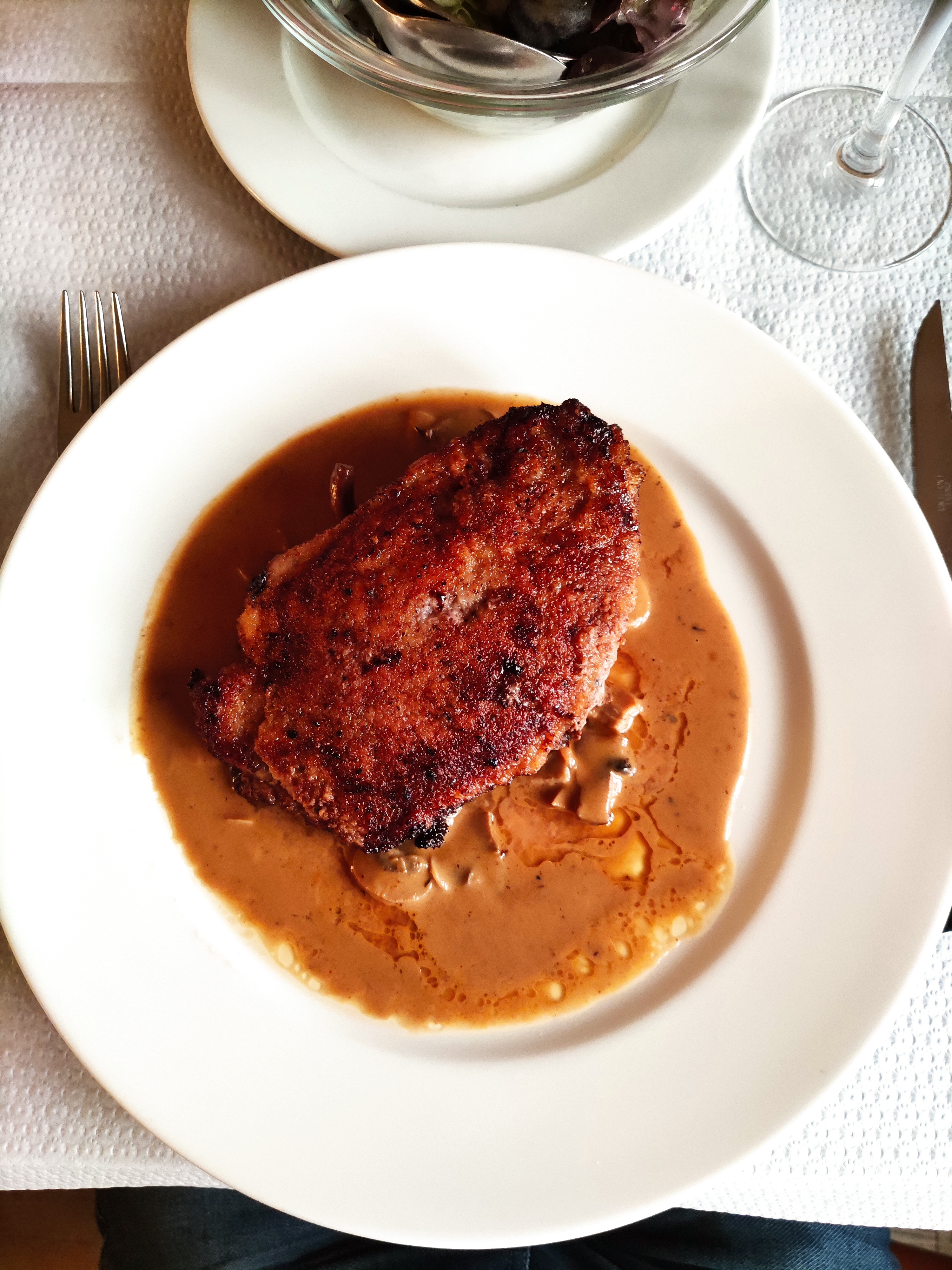 Nous sommes déçus de votre point de vue, vous êtes venu à 14 heures, dans l'après-midi à la fin du service, j'aurais dû vous refuser mais je ne l'ai pas fait, nous vous avons servi le plus tôt possible, vous êtes reparti nous heureux. Notre famille vous souhaite tout le meilleur pour votre prochain voyage. 16 € Euros pour une belle tranche de Noix de Veau avec une sauce crème champignon fait maison avec un fond mijoté à l'ancienne, c'est cadeau Madame !