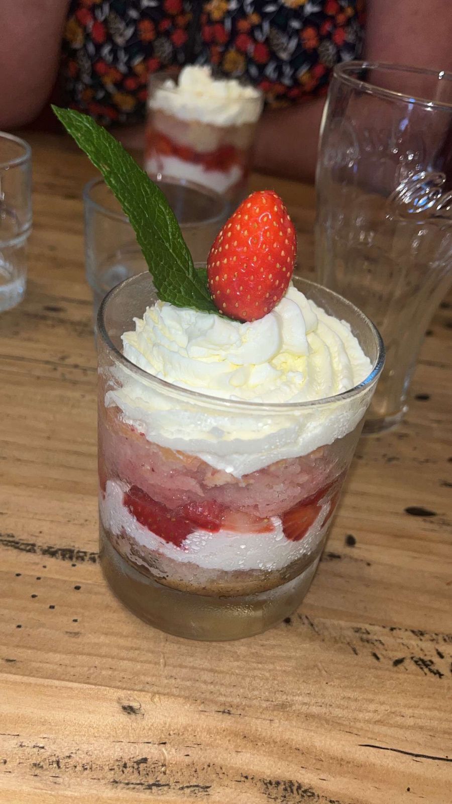 Retour sur la terrasse d'été pour profiter d'un rayon de soleil. Salade du commerce aux produits locaux. Excellent fraisier en dessert avec nos premières fraises ! Très bon accueil et service au top.