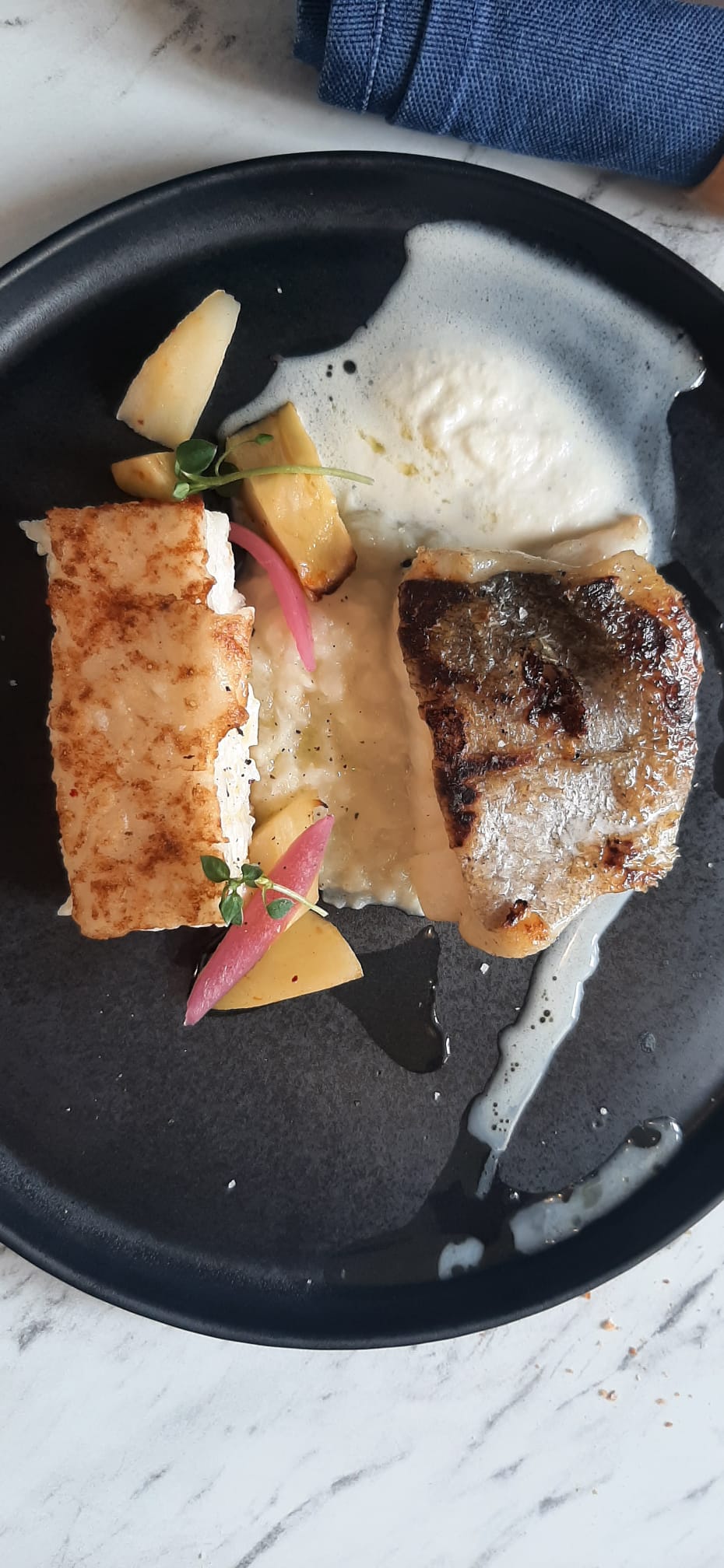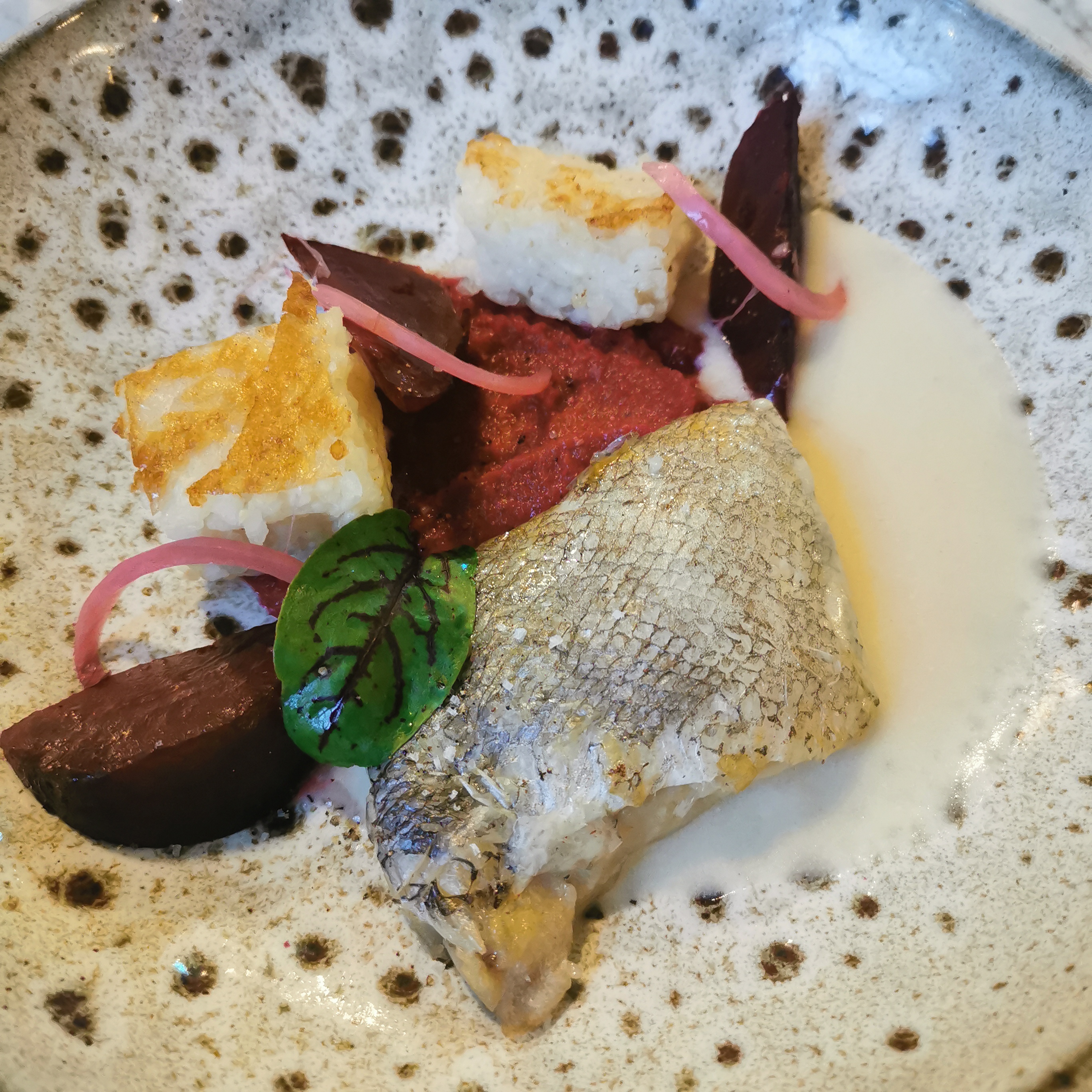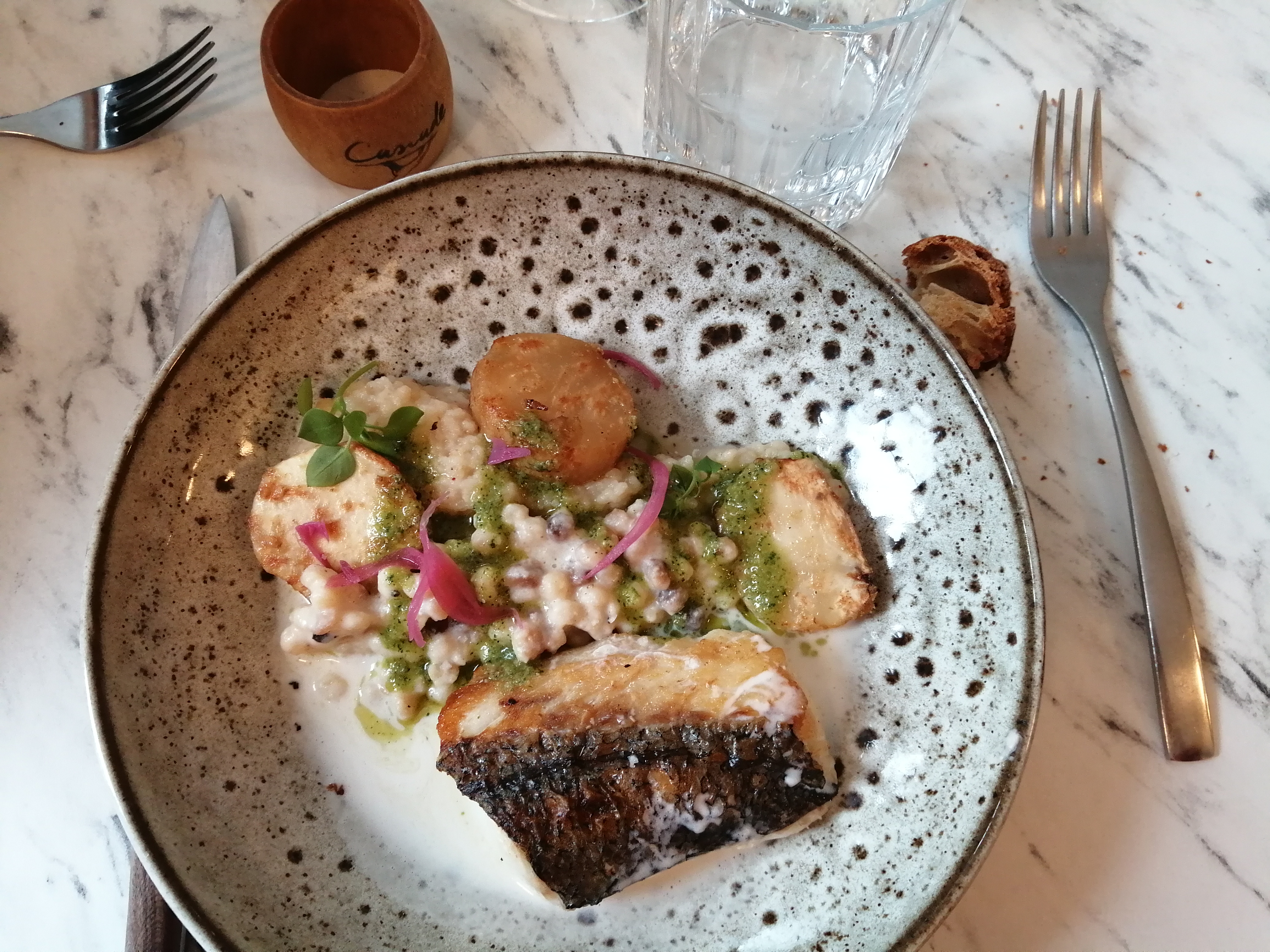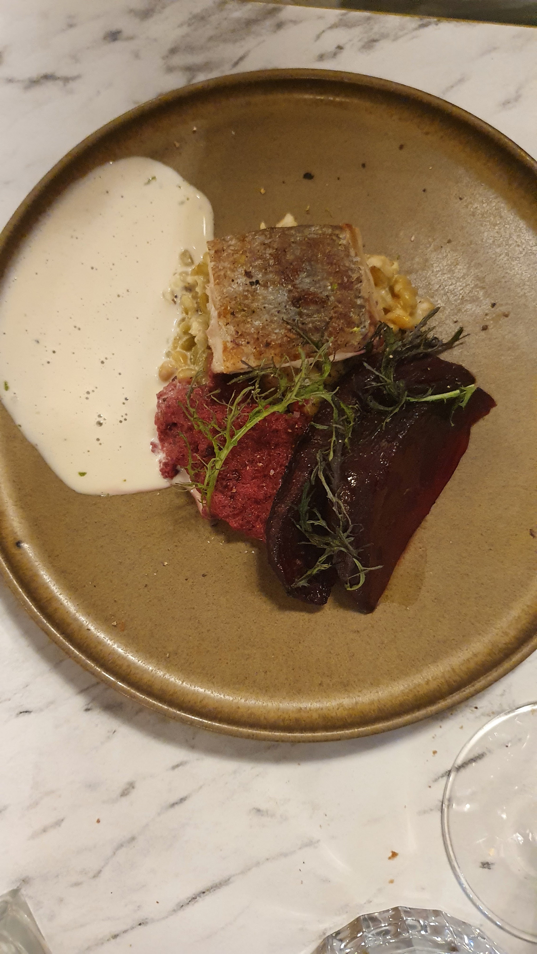 Le cadre est superbe, le personnel très sympathique mais je ne suis pas convaincu par la cuisine. Un risotto à la betterave rouge un peu pâteux élaboré avec un riz lambda et le poisson trop cuit.