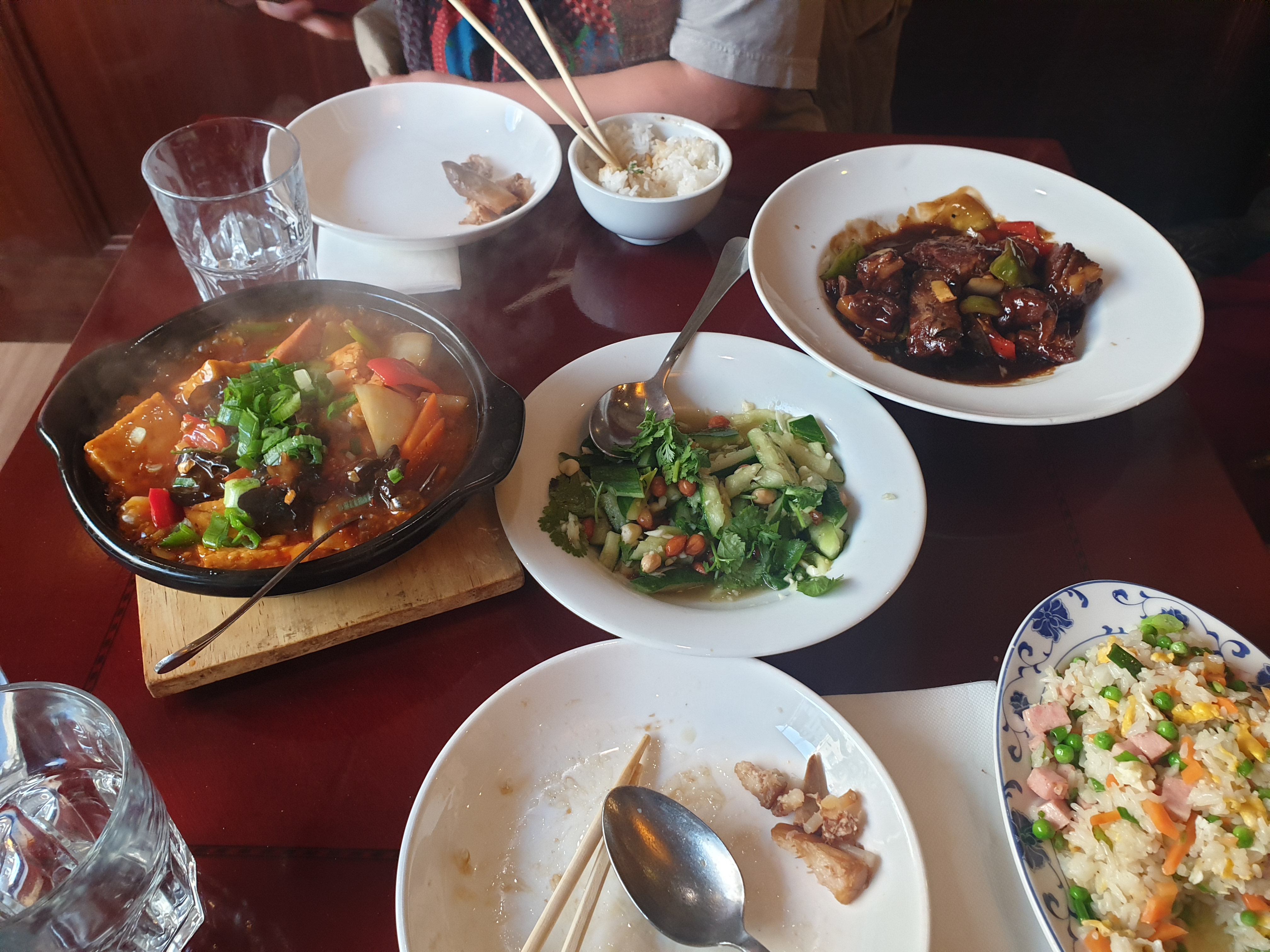 Bonne nourriture. J’ai vraiment apprécié. Des portions généreuses et savoureuses. Le service est sympathique. L'endroit est animé. Cela peut devenir bruyant ou peut-être était-ce simplement parce qu'il y avait deux grands groupes de personnes heureuses autour de nous. J'y retournerais sûrement pour essayer d'autres plats. Nous avons eu le riz cantonais, le porc braisé - aigre-douce, la salade de concombre et le tofu. Très bien.