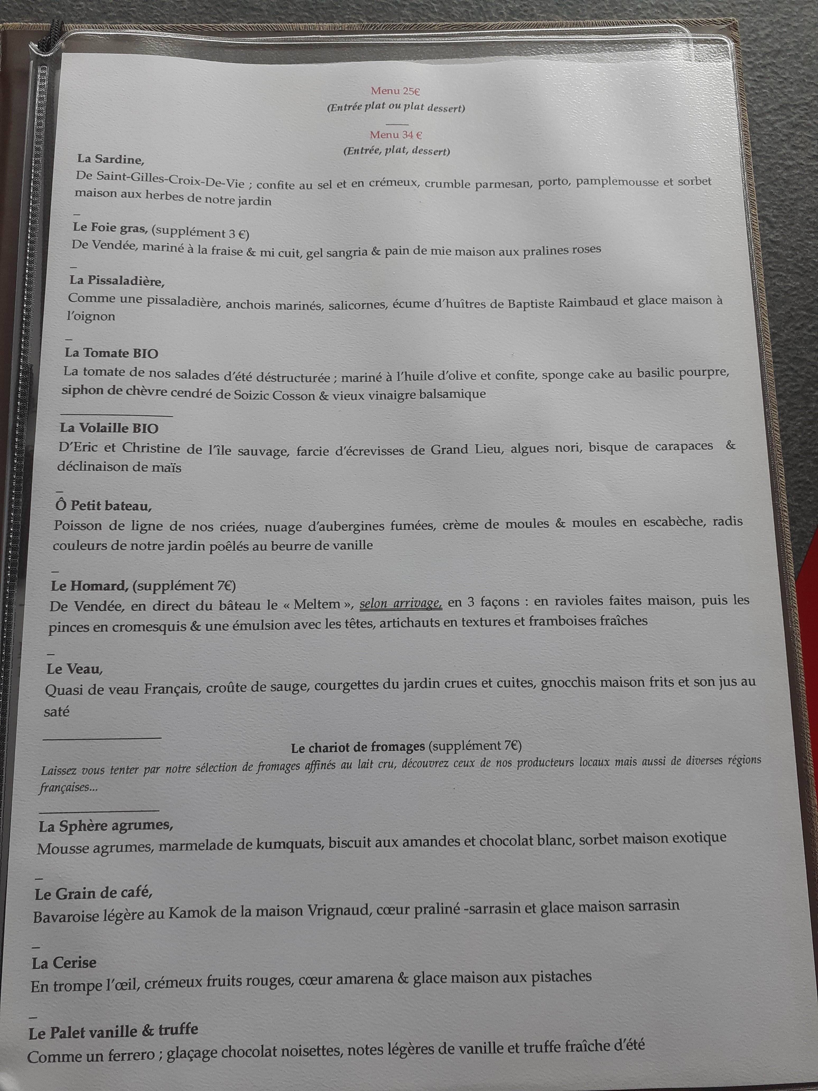 Le menu sur le tableau est à 22 euros avec 2 entrées 2 plats 2 desserts sauf que la serveuse au moment de la prise de clé ne nous a pas dit que le deuxième choix ne faisait pas partie du menu. A la sortie la sauce n est pas la même très déçu dommage car la cuisine est le service sont exceptionnel