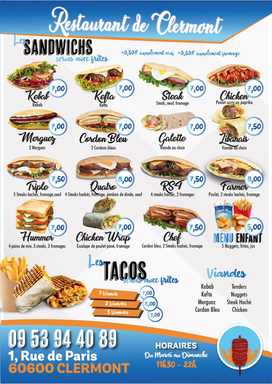 Kebab super bon , ainsi que les tacos qu'il fait super accueil et VRAIMENT généreux sur les quantités !! Le meilleur de Clermont