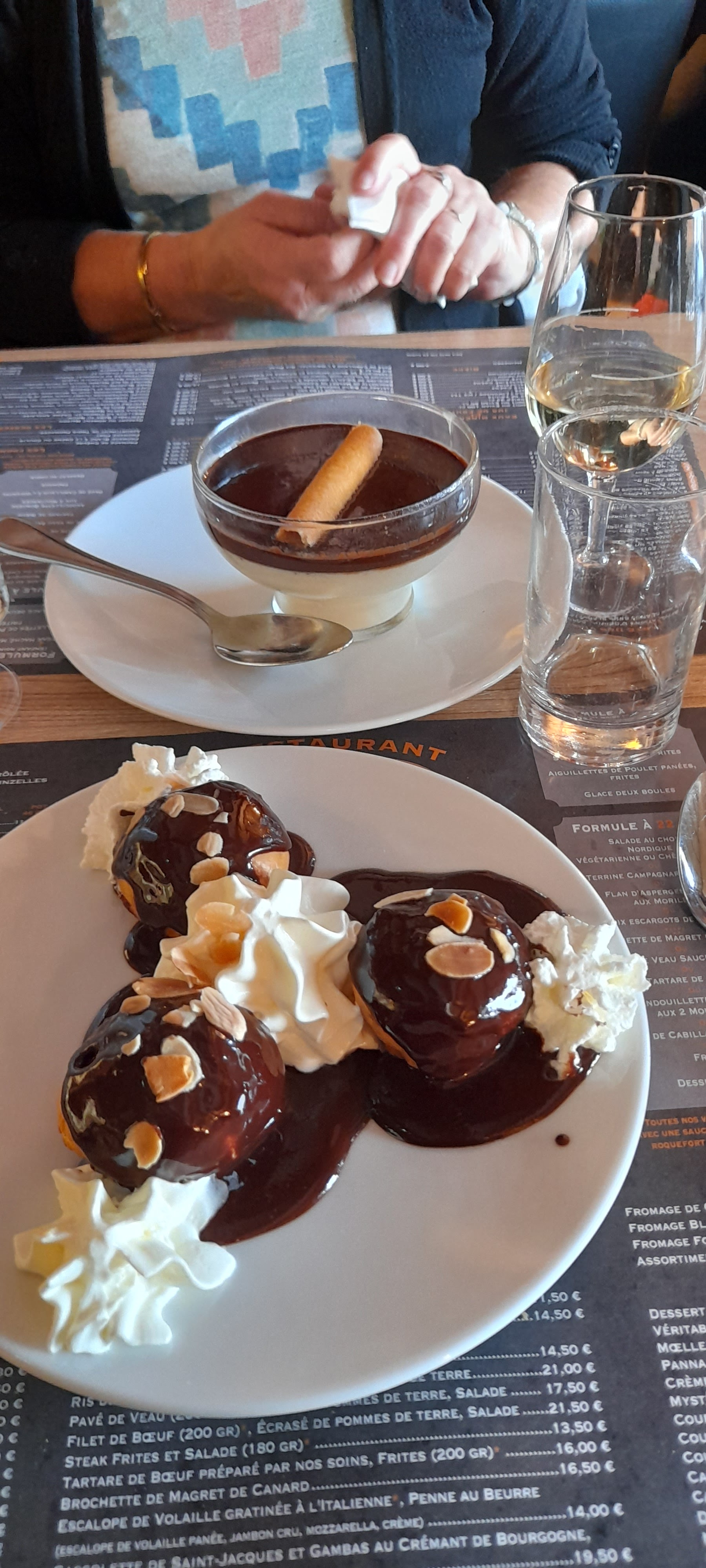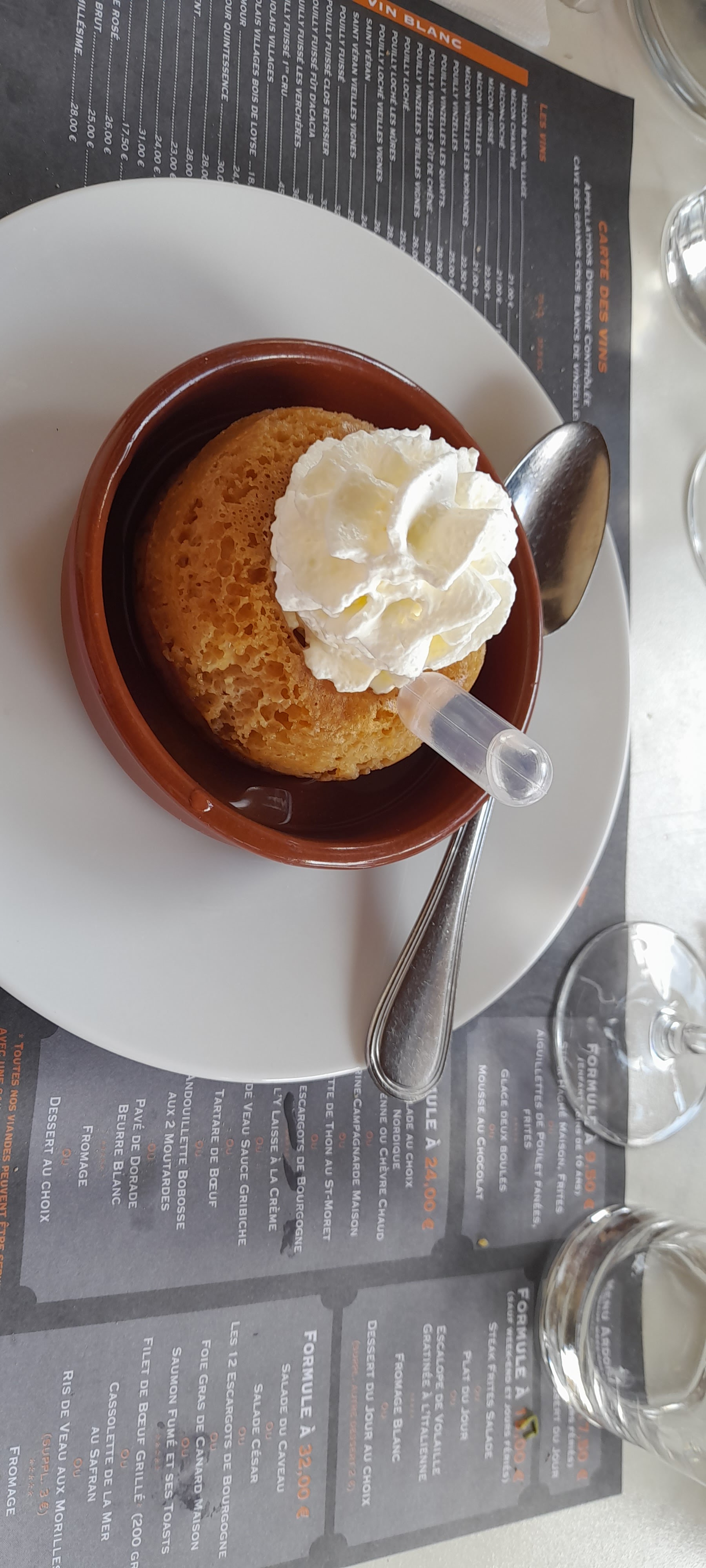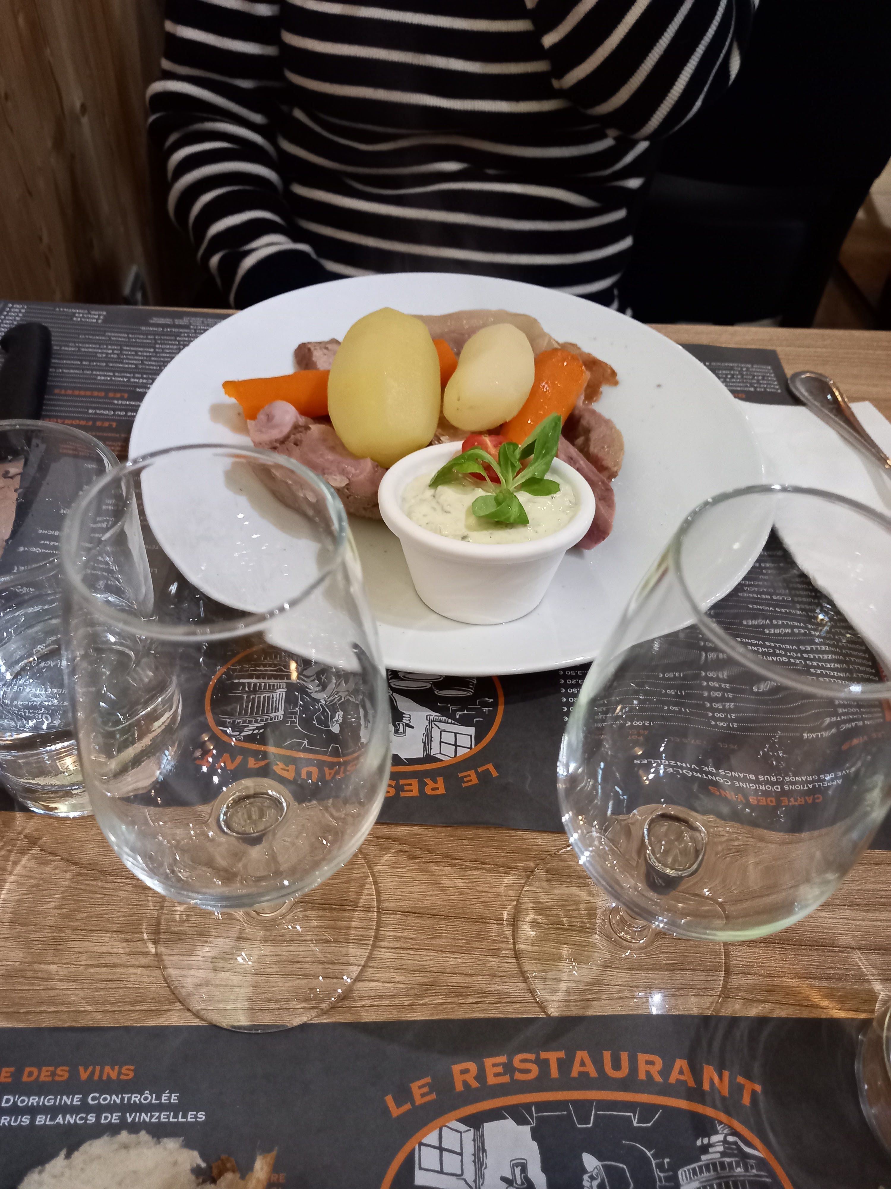 Très bon moment, des plats au top (ris de veau et escalope de volaille) accompagnés de Pouilly, excellent ! En terrasse sous un temps agréable, que demander de plus... Pour u que ça dure !!!