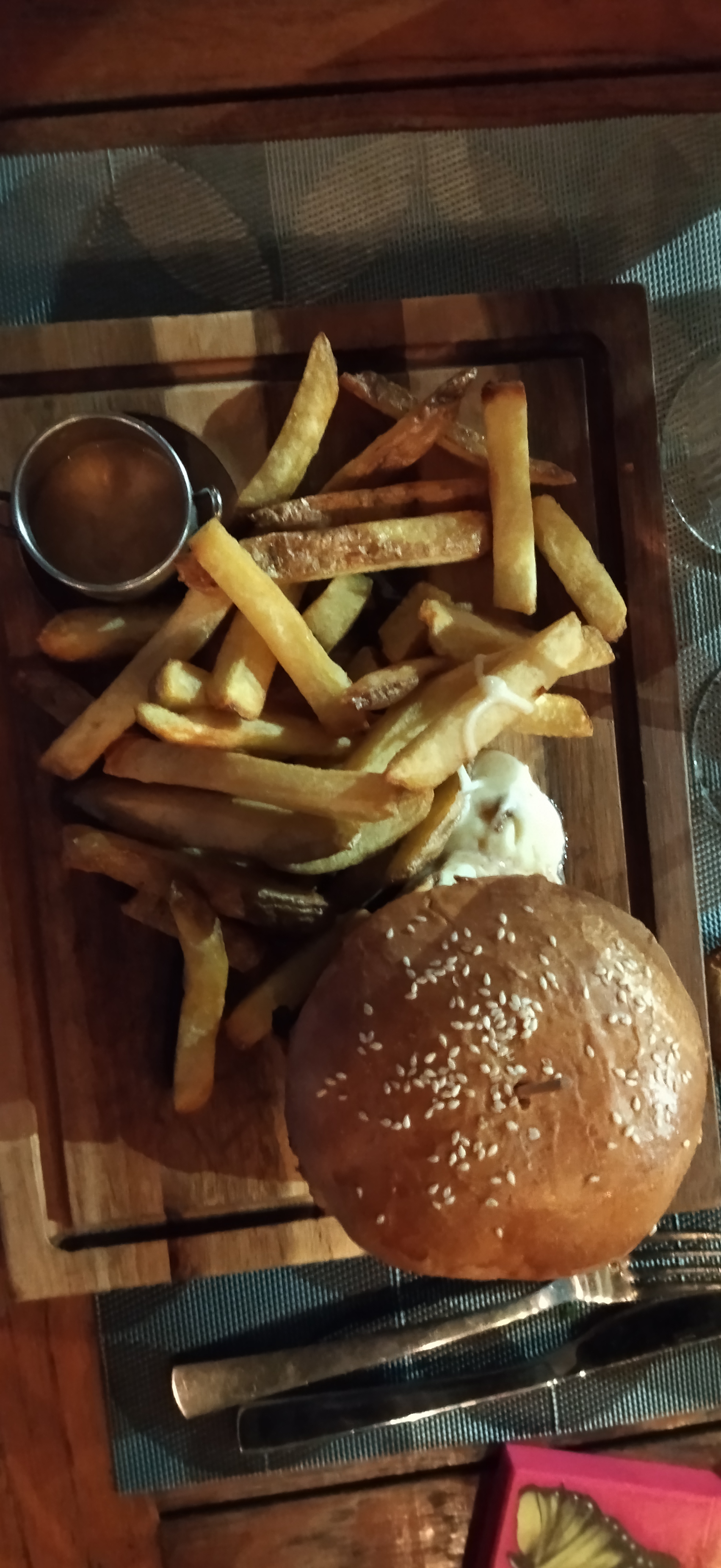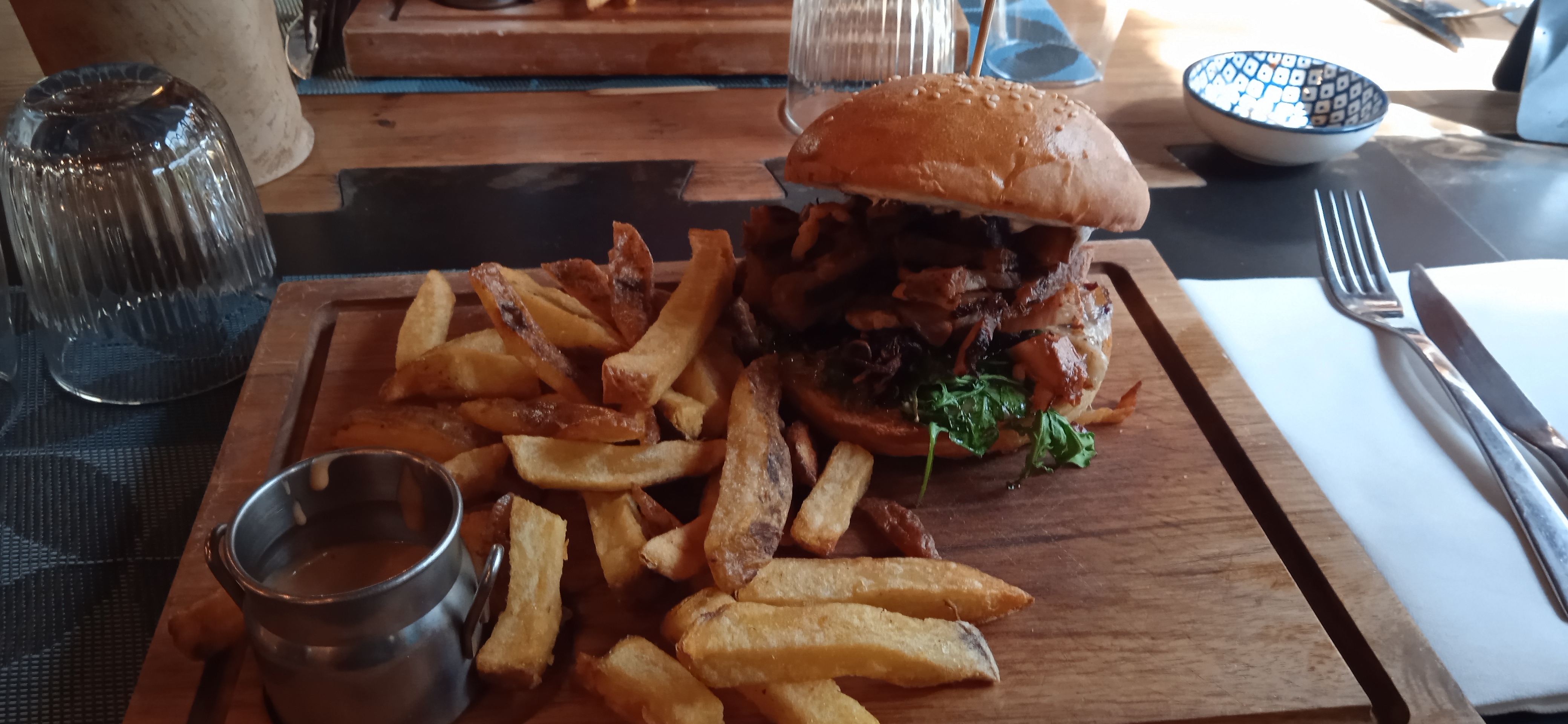 Table réservée à 12h45. Il y a eu un mic mac. On a eu une autre table qu'ils ont dû dressée. Une demi heure d'attente avant de prendre notre commande. Prise de commande à 13h30. La serveuse blonde n'a pas voulu nous expliquer les plats, vu que c'était noté sur internet en scannant le QRCode.Tjs pas de plat à 14h05... Repas servi à 14h10. Cote Plat trop salé. Pickles bons, hamburgers bons apparemment. Vu les prix, on s'attendait à des plats extraordinaires. Il y avait de bons avis, donc on a fait confiance. On n'a pas pris de photos des plats, car rien d'extraordinaire. Pour moi, le pire des restaurants de Corse. Heureusement que les autres restaurants de l'île que nous avons fait rehaussent le niveau. A bannir si on ne veut pas trop attendre ou être servi avec le sourire. Trop cher pour ce que c'est. Et cette serveuse blonde devrait revoir son accueil !!