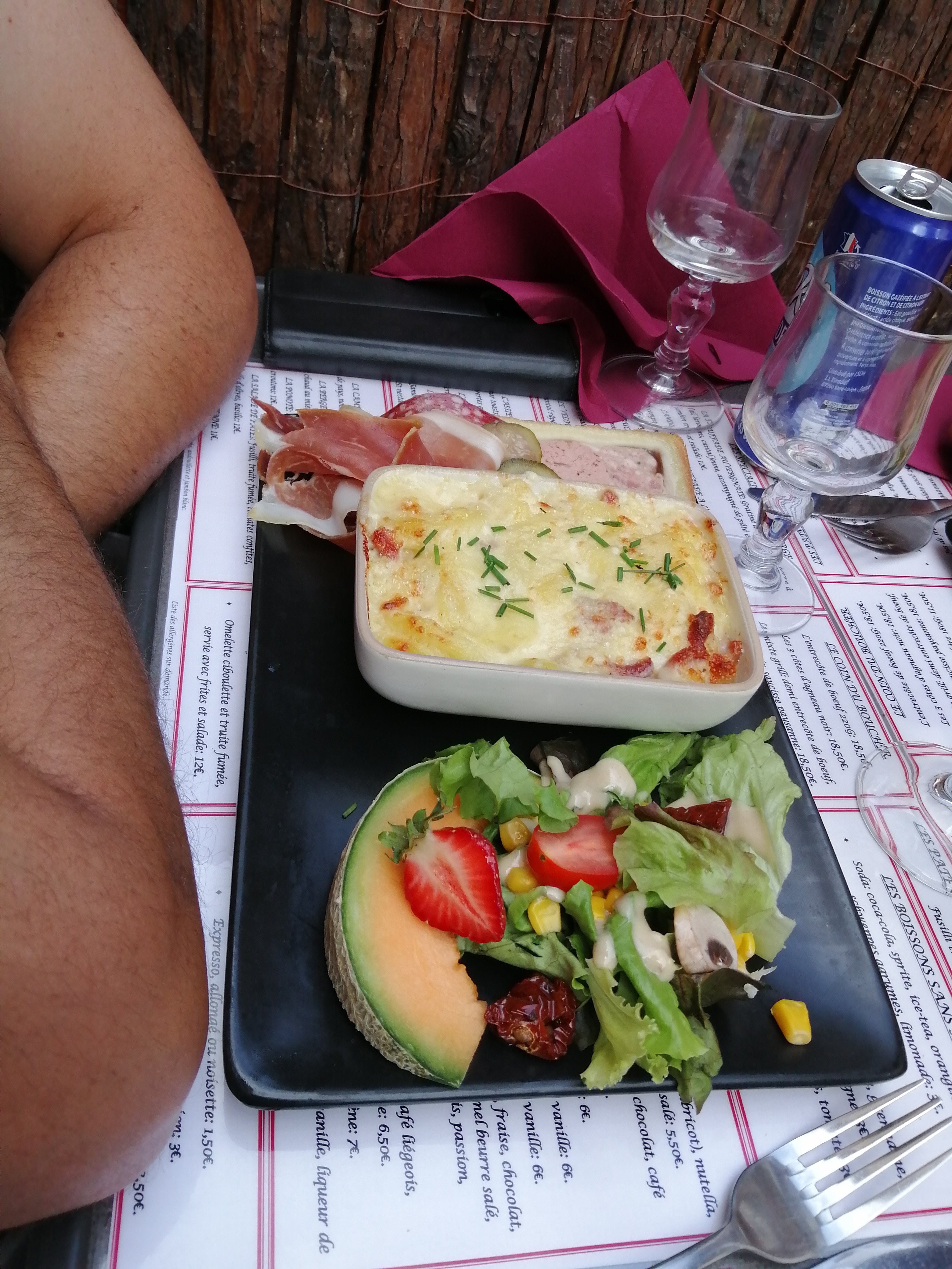 Charcuterie et salade quelconque de supermarché, gratin de pomme de terre classique (sûrement industriel) et on cherche les lardons promis. Beaucoup de choses beaucoup trop salé. Serveuses sympathiques