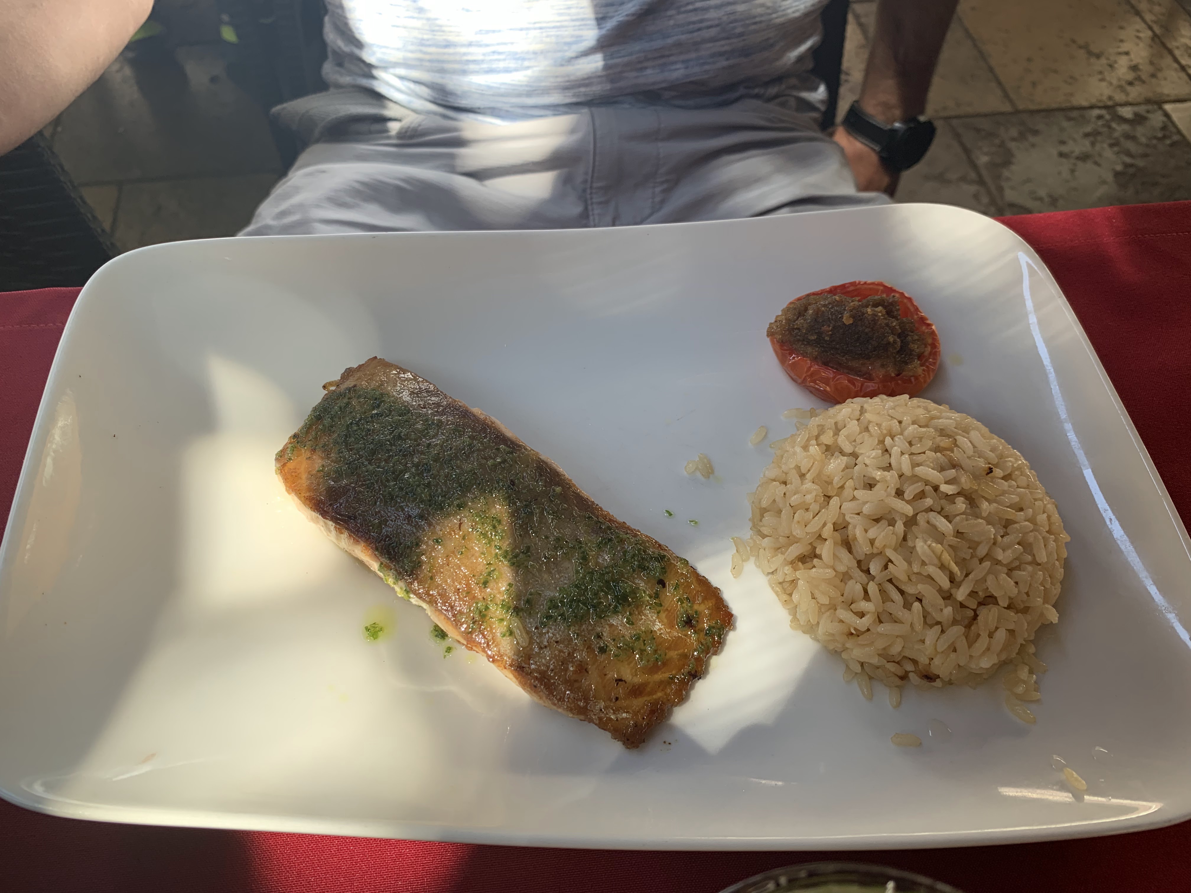 Personnel pas hyper souriant. Terrasse agréable avec choix d’ombre ou de soleil. Les plats bons : bar grillé et burger malheureusement avec un steak car il n’y avait pas de poulet et personne nous l’a notifié quand nous sommes arrivés. Pas possible de changer d’accompagnement, grosse déception, surtout quand on est pas en plein rush et qu’il est même pas midi.. Desserts : un brownie, les mêmes qu’on achètent au supermarché, au moins il a bien décongelé. Et sunday ok. Ne prenne pas les tickets restos. Prix corrects. En résumé assez mitigée, plats bons mais pas mal de choses à revoir.