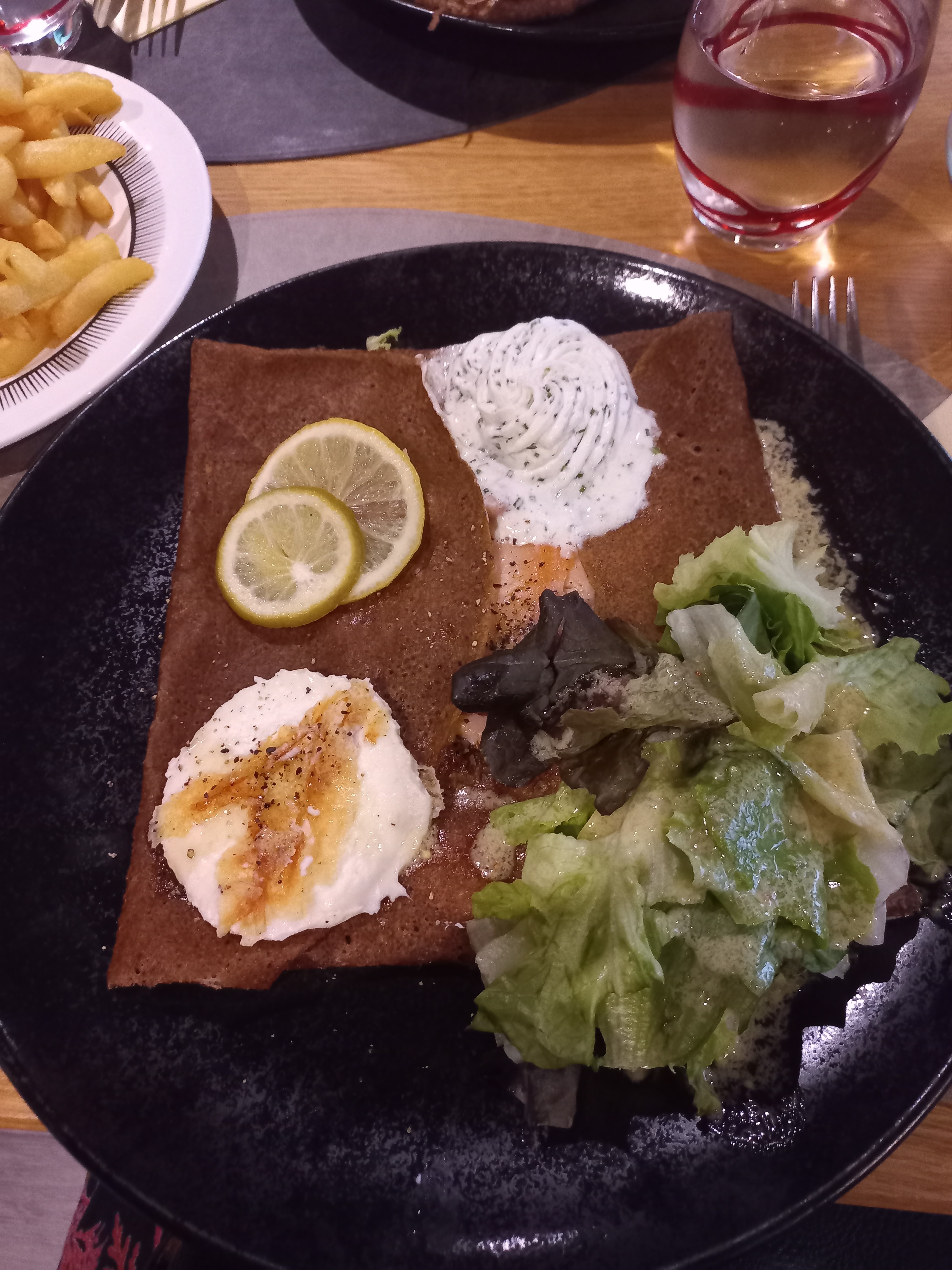 Nous avons mangé 2 fois durant notre séjour. Un midi et un soir. Le soir, nous avons été plus long à être servis mais la serveuse s’est bien excusée pour l’attente. Beaucoup de choix dans la carte. Les galettes sont bonnes et copieuses, le poisson et la viande très bien cuits. La viande était très tendre. En résumé une belle adresse pour un bon rapport qualité prix et très proche du mont saint Michel