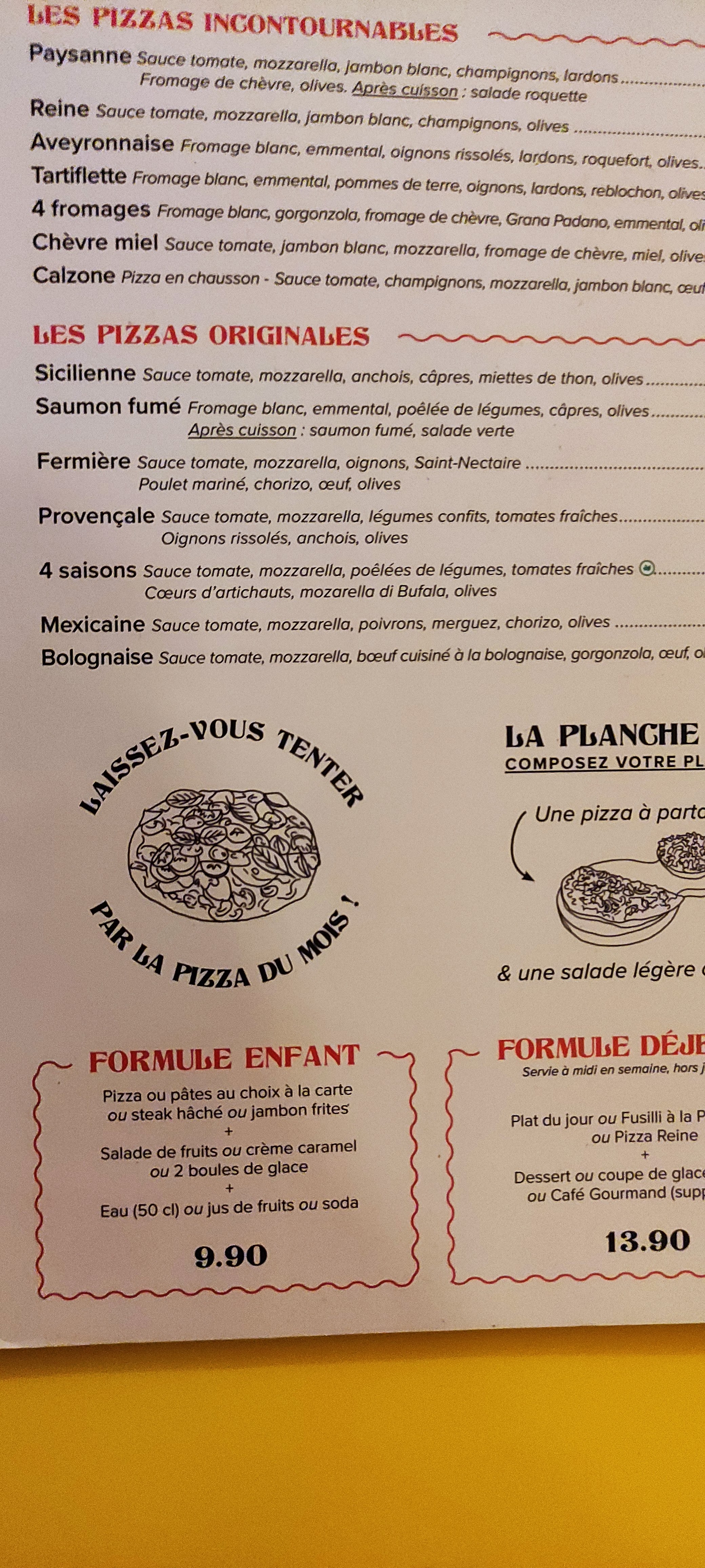 Bonjour, Nous proposons pourtant une quinzaine de pizzas... Néanmoins, merci pour votre note à propos de notre restaurant. À bientôt !