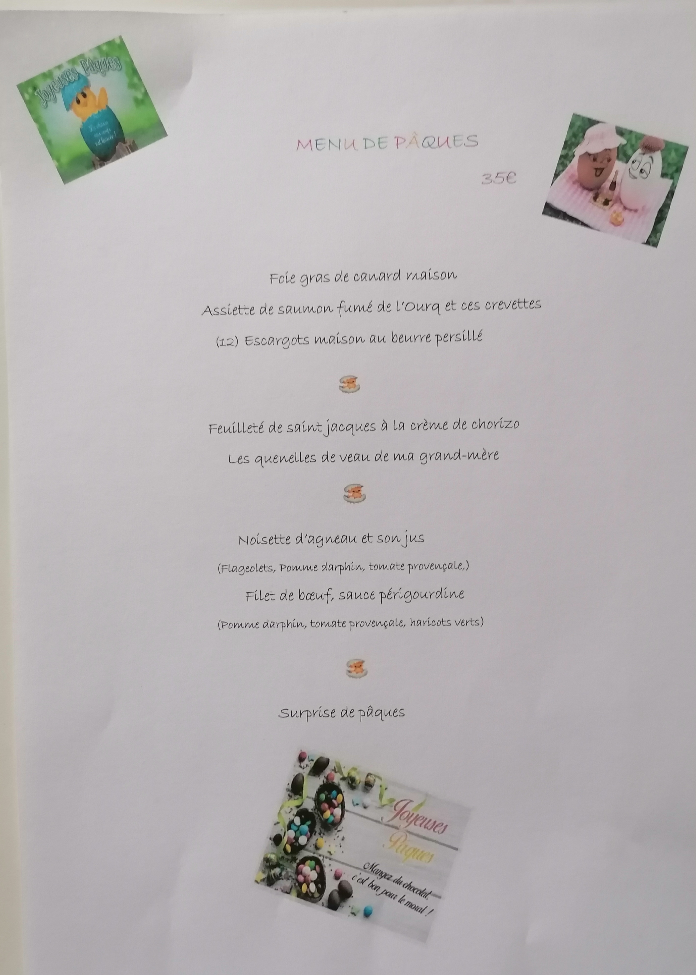 Déplorable, J'y vais,le vois cuisiner , je peux vous dire cette homme je l'aime , il est reconnu dans la region mais ces produit ne sont pas locaux de mauvaises qualités.. Tout ce sait . Des gens du coin mon expliqué.. J'ai commandé apres 2ans décu ou je n'y suis pas aller. Gigot d'agneau et le lendemain moule frite. Une horreur alors que je le vois s'affairer dans ca cuisine et ca me désole car il bosse vraiment se fatigue vraiment, le Gillot de mauvaise qualites alors qu en cuisine magnifique quand on le voit , trouveras mal cuit sans gout j'ai du le le faire plus cuire et rajouter de l'assaisonnement . . Pour les moules 😄, fraiches et fermées et je les entendez non cuites , je suis malade donc j'ai demandé 2 portions( non cuites)aucun soucis sur 2 jours mais médiocre nul moules de mauvaises qualités, a 70℅, pasde sauce nul. Quand j'ai commandé un ami et client parler avec le chef , lui disait tu aime l'argent etc.. Sans ce rendre compte que j'étais la. Une connaissance m'a dit ah oui j'etais la moule frite implacable mais moi malade pas de frite devant mes yeux j'ai demandé une salade il a ouvert le frigo m'a servi juste de la salade alors que je lui avais dit la veille .. Je sais pas tomayes etc... Je viens de paris , je ne connais personne, mais en cuisine je m'y connais quand on m'a dit l'agneaiu et les moules etaient bonnes, j'ai compris ferrme ta gueule .... Tu es un etrange même dans ton pays.. Cette homme est extraordinaire, je suis cuistot mais .... C'est fade