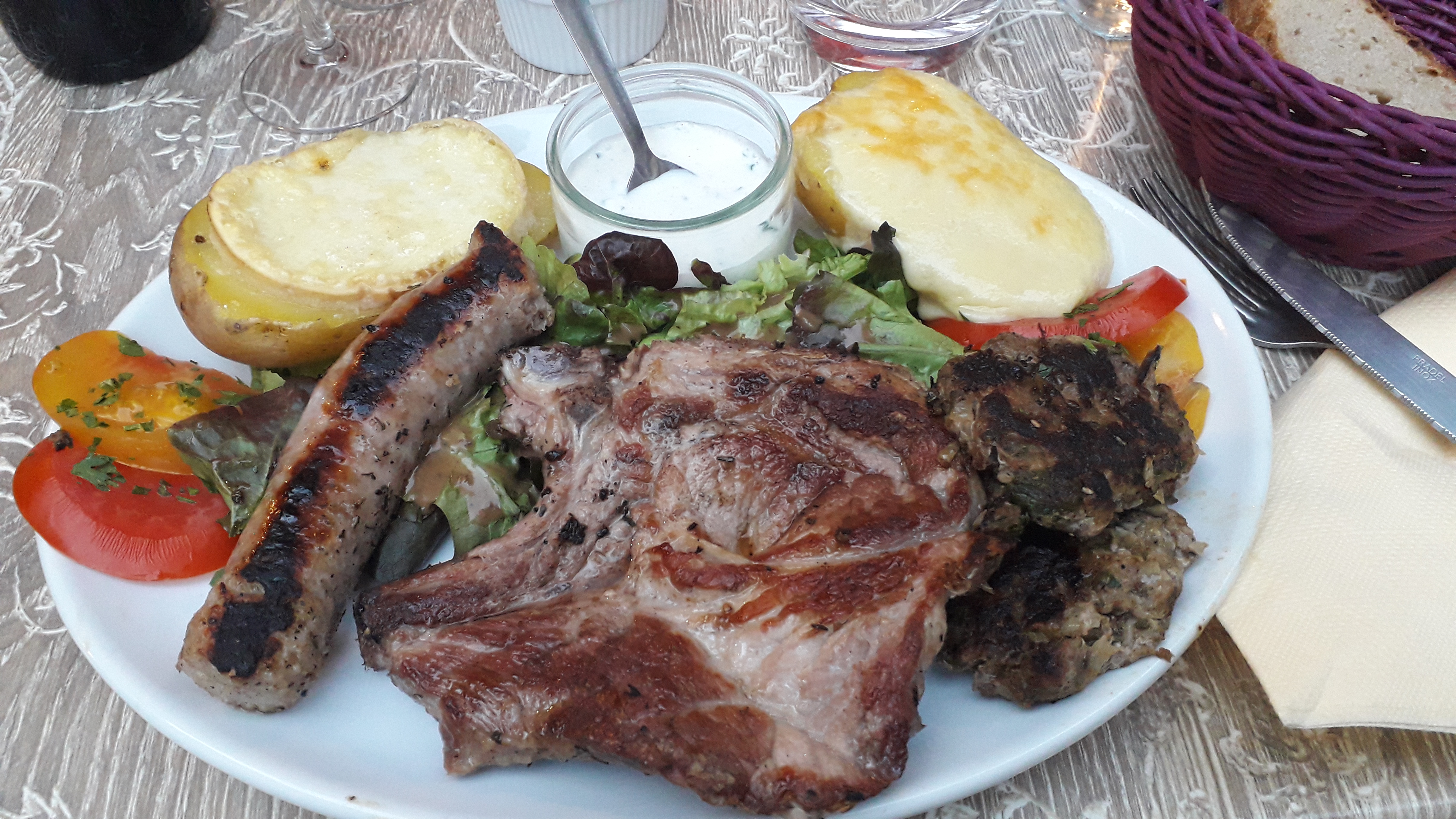 Super endroit où l'on peut déguster de bons plats de viande assortis de pommes de terre au four. Repas copieux avec de bons desserts maison.