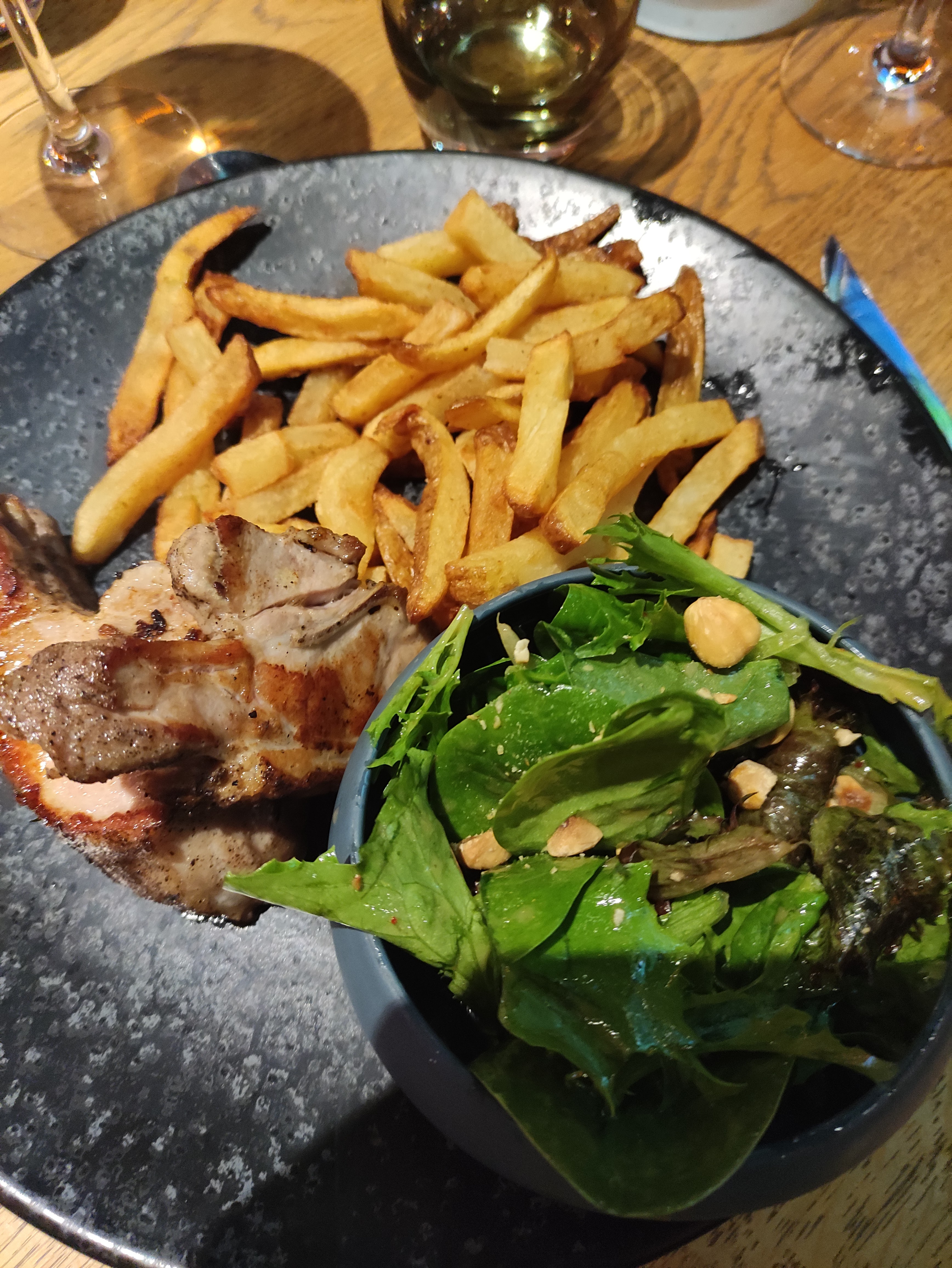 Très bon dîner, service parfait et serveurs adorables ; quant au cadre clinquant comme un eurodisney lot et garonnais, avec ce qu'il faut de folie pour faire sourire, tout a été pensé réfléchi, dommage que gifi ne commercialise pas les chaises du bistrot ou les lustres du gastro j'aurais couru les acheter à prix gifi. Juste un petit bémol, le bandeau lumineux du bistrot pourrait peut être à la longue rendre fou...