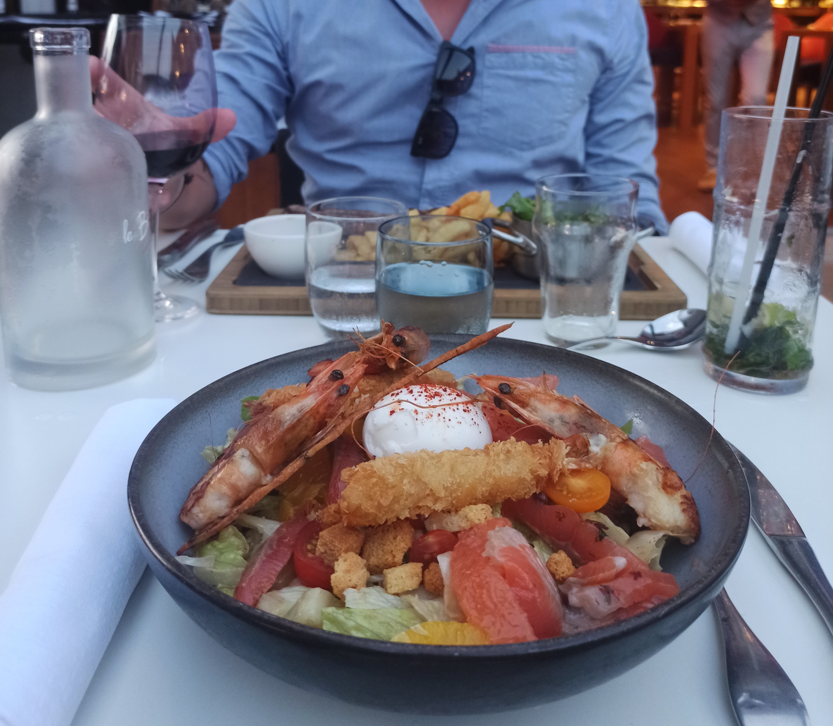 Dîner pour mes 50 ans D'emblée le barman fait l'énorme boulette disant que les invités pour la surprise sont arrivés. Table réservée depuis assez longtemps mais malgré tout on s'est retrouvé sur le bord extérieur de la terrasse presque dans la haie pour une invitée. Nous avons eu l'impression qu'ils avaient mis cette table à la dernière minute malgré des tables de libre sur la terrasse couverte. Ensuite prise de commande un peu longue et plus de 3/4 h d'attente pour voir arriver les apéritifs une fois avoir été le signaler au bar, cocktails très peu alcoolisés pour ne pas dire pas du coup et une fois l'apéritif servi plats chauds amenés dans la foulée. Très mauvais timing, serveuse limite agréable. Produits de qualité tout de même mais assez onéreux. En résumé très déçue de cette expérience