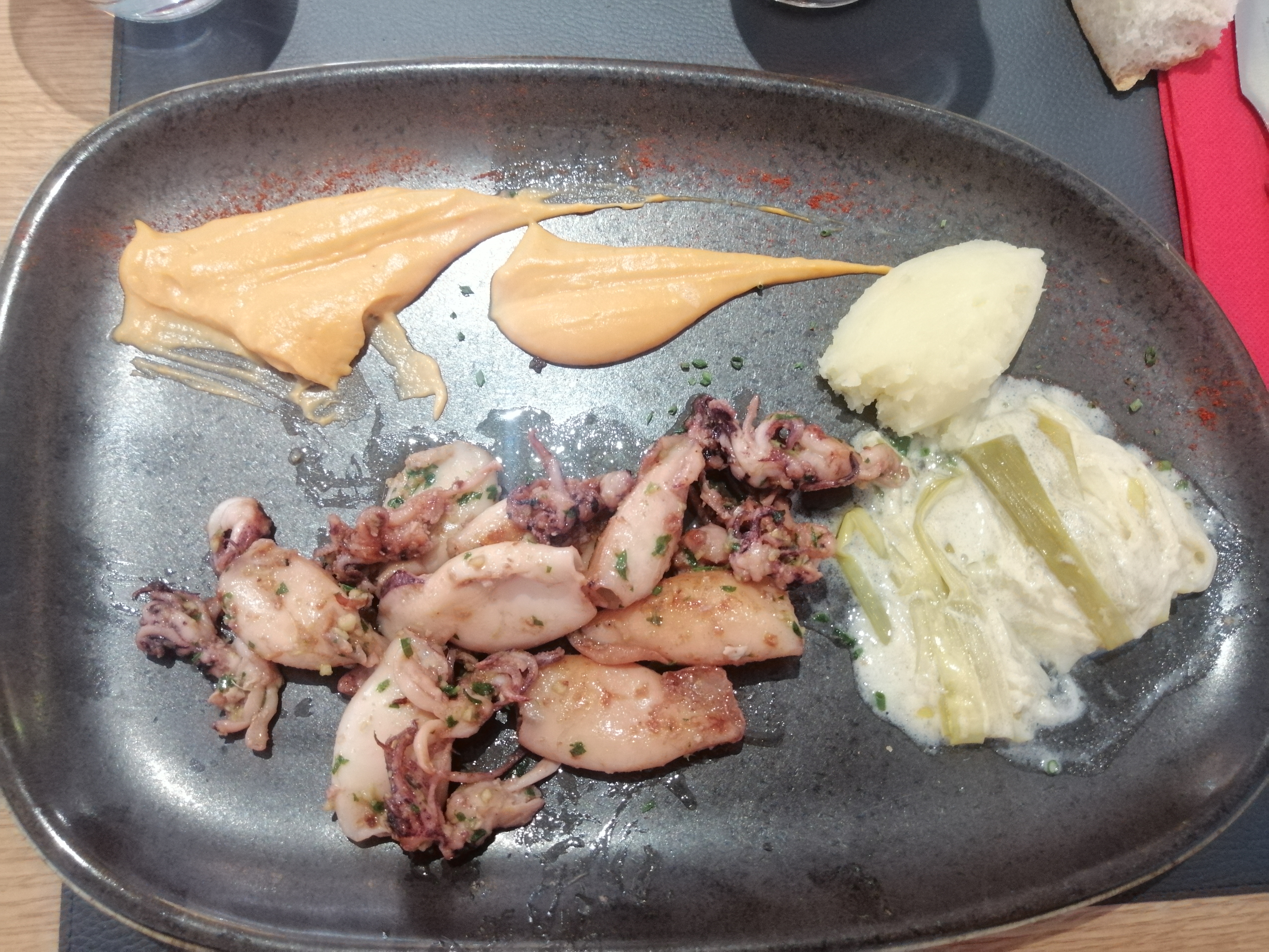 Nous avons pris la trilogie, c a d ,suppions ,gambas et morue. Les ingrédients y étaient bien , mais pas du tout cuisinés ...recouverts d un mélange ail -persil cru... Et l accompagnement peu abondant. Franchement déçus. Le café gourmand a relevé la note...