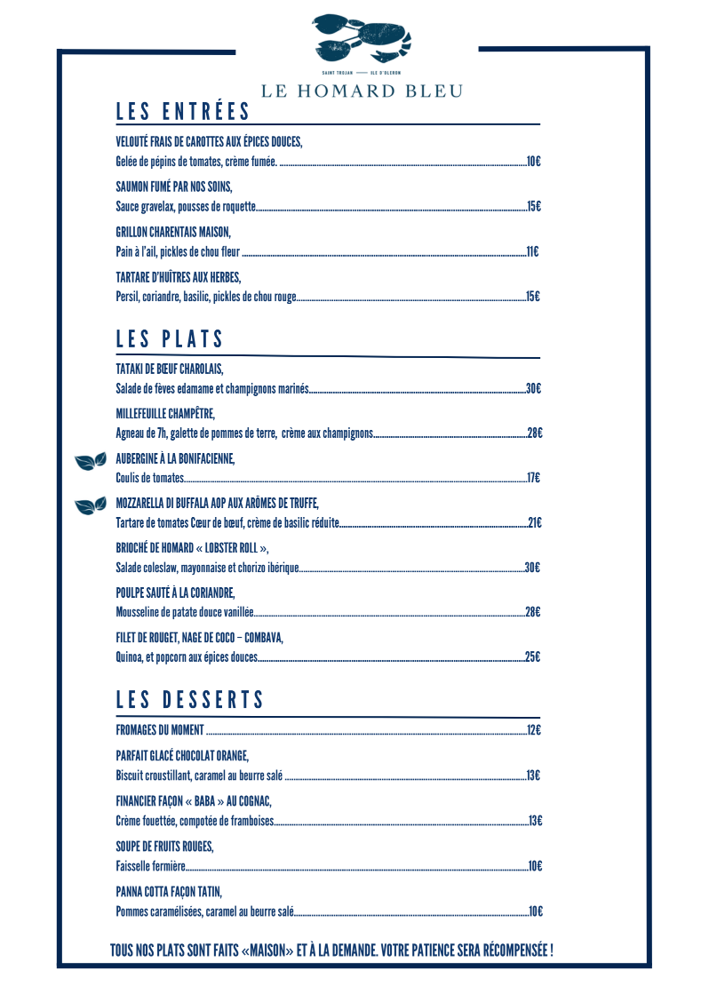 Bonjour Marc, Tous nos produits sont frais, de qualité et choisi avec soin auprès de producteurs locaux, cuisinés par un chef et servis face à la mer, ce qui justifie leurs prix. Très belle journée, L'équipe du Homard Bleu