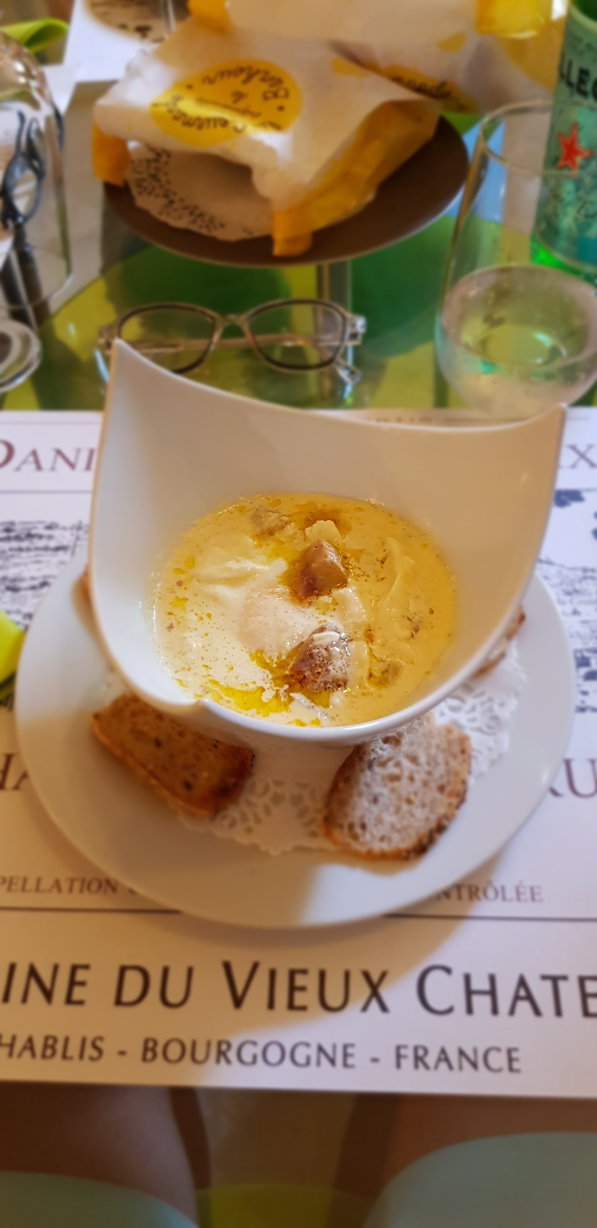 Complètement déçus ! Le repas et le service ne sont pas au niveau du lieu . Les serveurs n’ont pas une tenue approprié, mais sont plus tôt négligés. Pain congelé ou la mie est enlevée pour ne pas que le client s’en aperçoive. Vin rouge froid ce qui est un comble pour un restaurant au cœur des vignes à chablis. La spécialité de la maison à savoir le jambon à la chablisienne est vraiment décevant, sauce fade, jambon sec et trop cuit. Les desserts ne sont pas maison, tiramisu à la poire qui ressemble plus à un renvoi alimentaire. Figue rôtis froide et séchée avec une mousse au pain d’épice fade. Je ne recommande absolument pas cette adresse .
