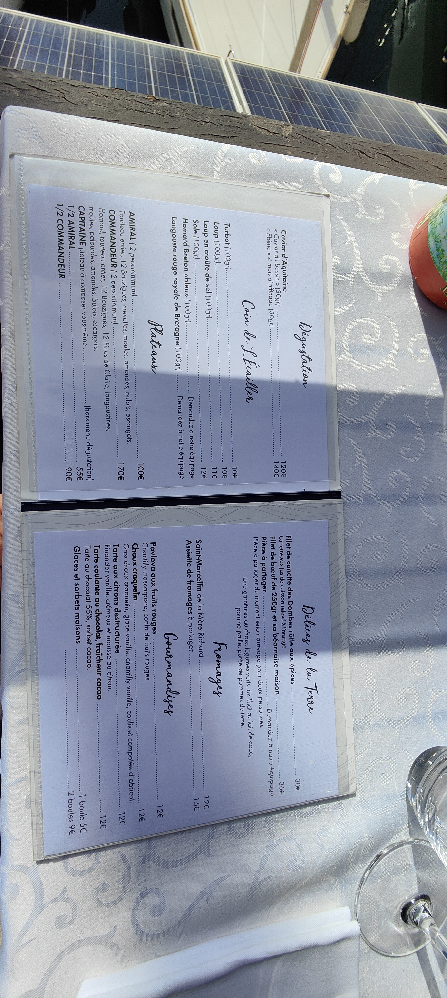 Lieu enchanteur, magnifique vue sur le port Couteau à tirer, champagne avec framboises, turbot excellent, un peu long à pêcher, mésentente de service et desserts gourmands. Très bon service, très compétent et commerçant. A recommander pour une soirée inoubliable 👌😁🤩😎🦋