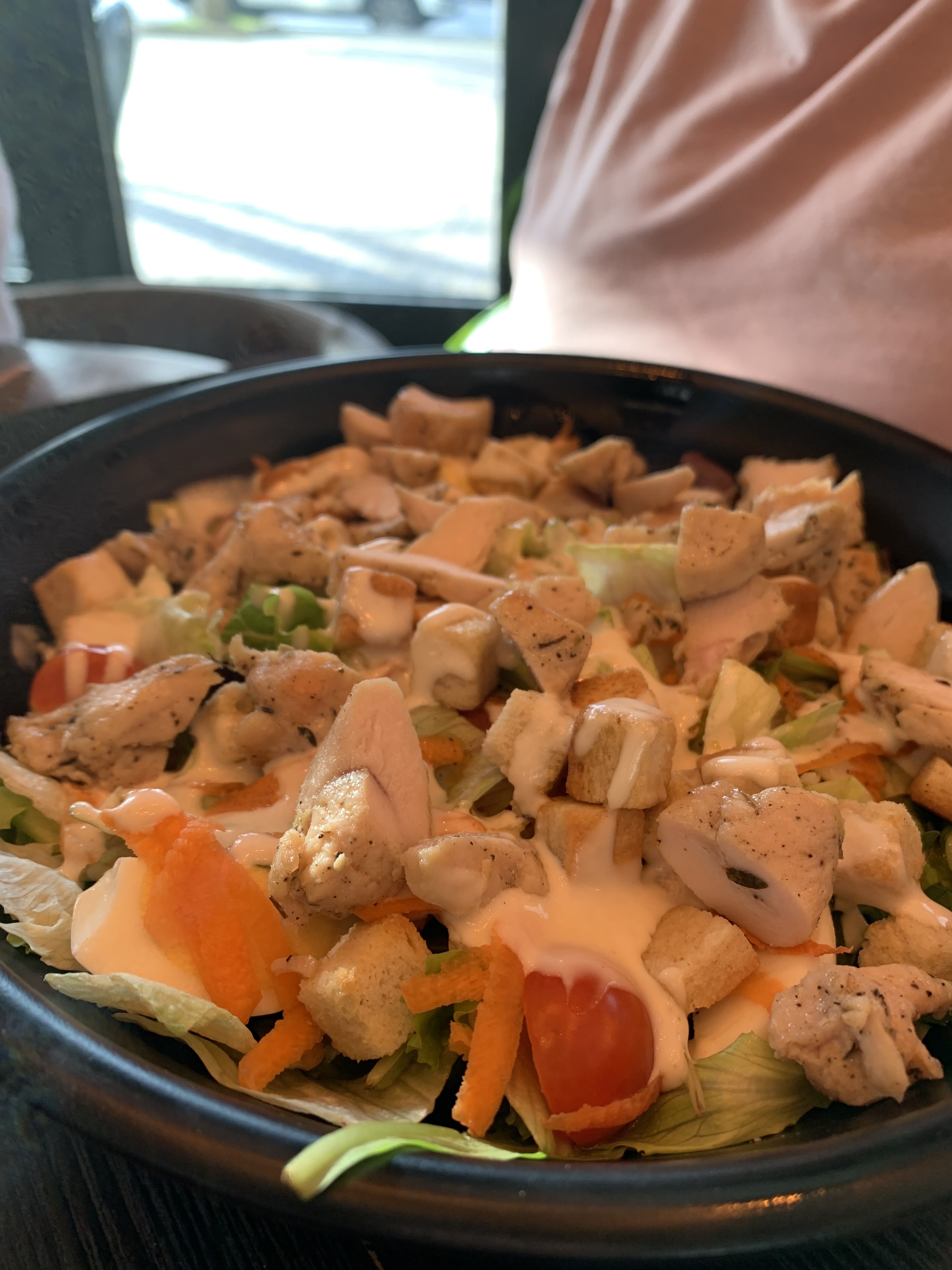 Une salade césar plus que médiocre, la sauce marron violette au goût très étrange et le poulet pané dessus tres froid , dur et pas bon du tout !! Pas de copeaux de parmesan mais un semblant de poudre parsemée sur le tout. Le point fort c'est l'accueil : serviabilité et amabilité du personnel .