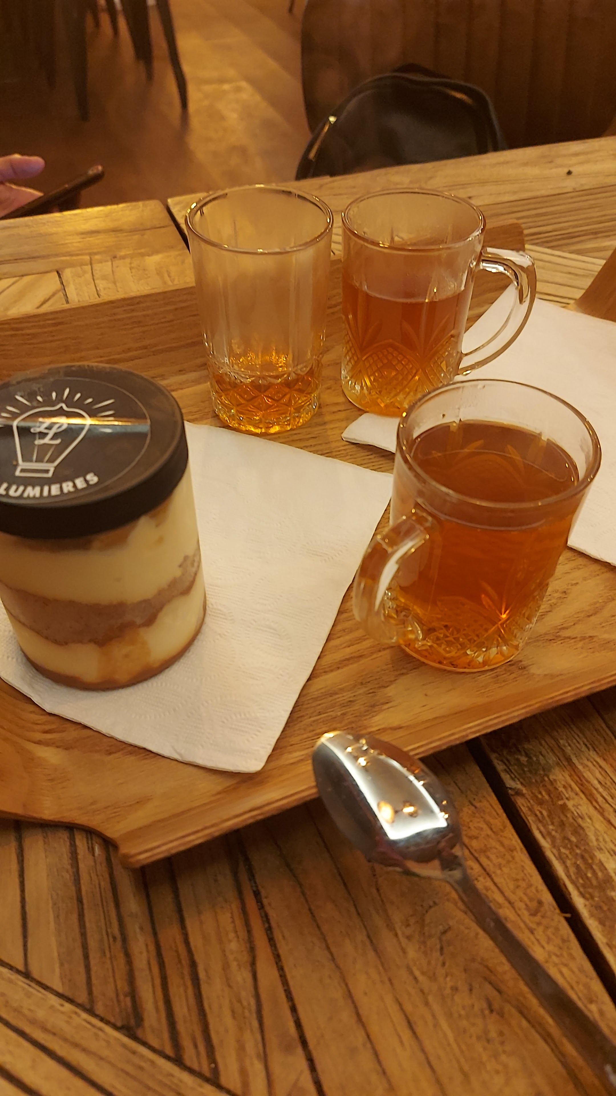 Le plat était bon , le gâteau au chocolat aussi , par contre la table collante , vous demandez à ce qu'on repasse dessus c'est limite vous les ennuyer pour être courtois. Le thé à la menthe sans menthe servi au verre alors que nos voisins de table dans la théière. Le smoothie ou la purée de fruit coupé à l'eau plus jamais. Dommage