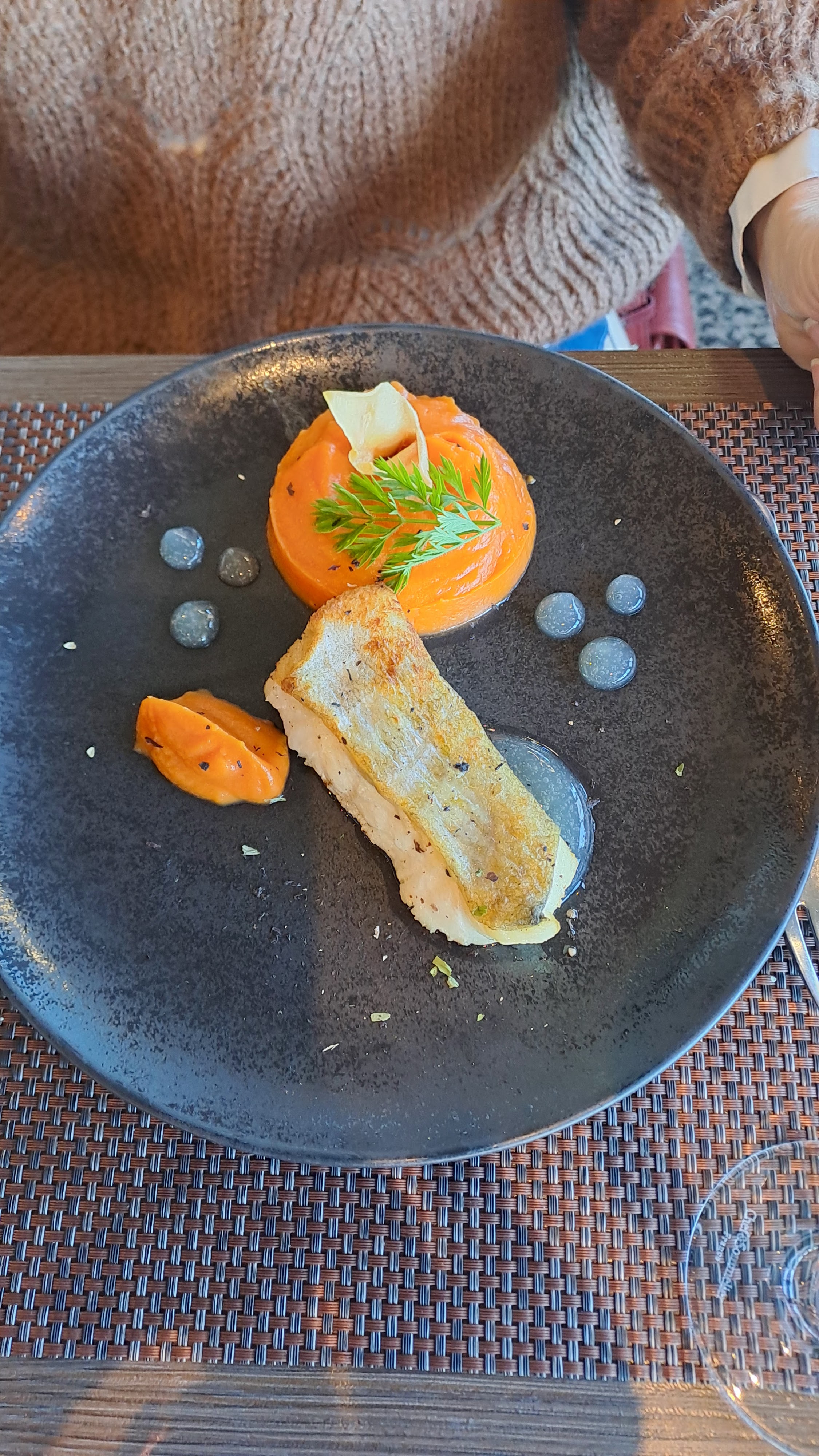 Bien mangé certes mais, manque d'assaisonnement... Plat qui manquait d'équilibre, 2 ballotins de suprême de volaille pour une quenelle de patate douce...plus de viande que d'accompagnement...