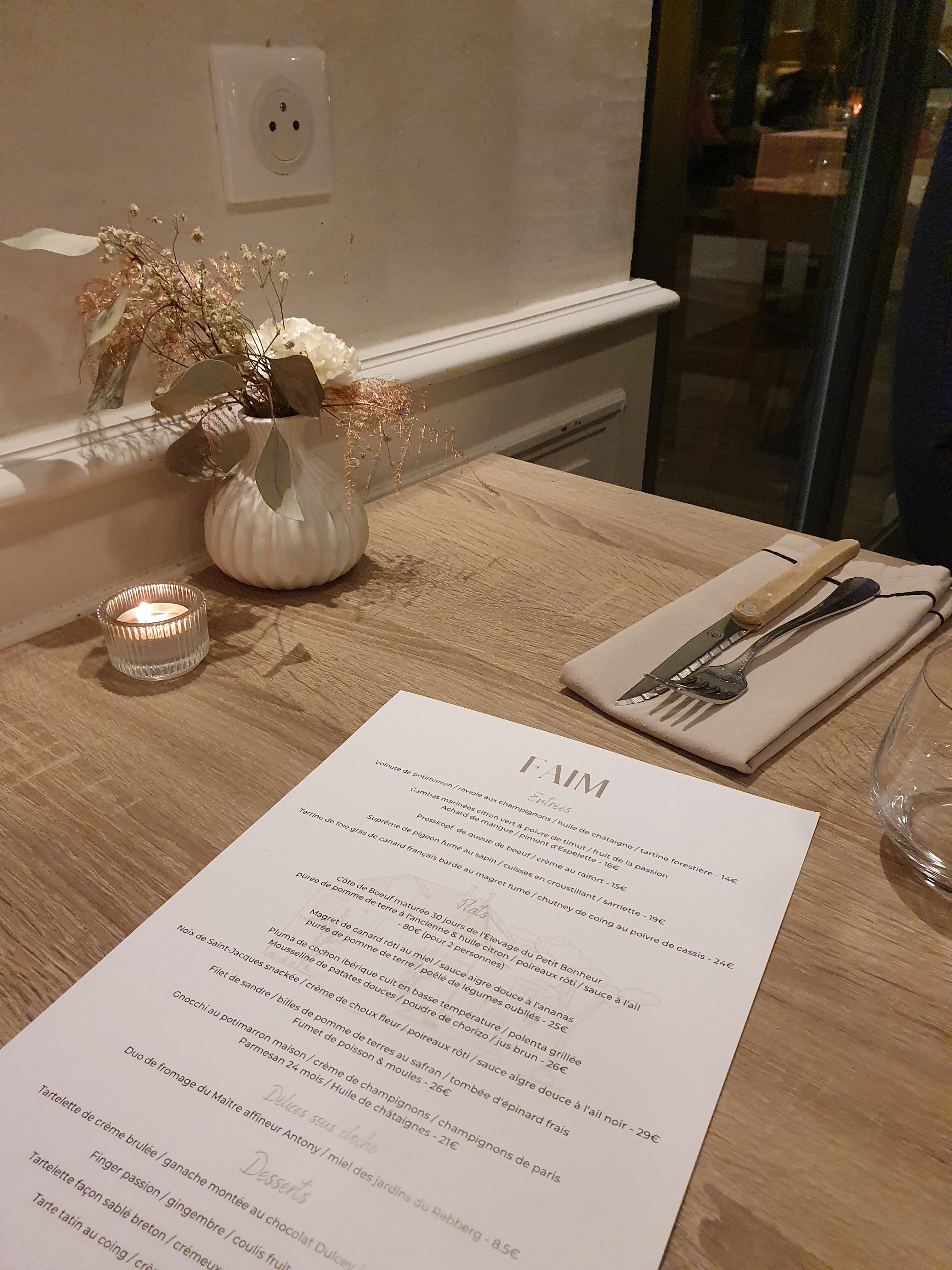 Découvert avec le passeport gourmands, je reste sur ma « faim » Je pense que le chef doit être soit très jeune, soit peu expérimenté, soit qui manque de confiance en son travail et c’est fort dommage car les idées sont bonnes et les techniques globalement maîtrisé. On commence avec un amuse bouche foie gras, assez sympa mais léger en goût! Mon entrée : Ceviche de thon … outch… on est clairement sur une entrée 0 saveurs. Le thon a sûrement été congelé et mal décongelé derrière car la texture n’avait rien d’un thon bien frais comme on aime le retrouver dans un ceviche…. L’accompagnement, des fruits rouges surgelés ( dont seul un peu d’acidité ressort ) et un fond d’assiette tres neutre… c’était véritablement de l’eau coloré. Pourtant on annonçait sur le menu un « leche de tigre » qui reprend du piment, du citron et beaucoup d’herbes…. Rien de tout ça pour cette entrée. Mon plat : belle surprise sur la cuisson du poulpe qui était PARFAITEMENT maîtrisé !!! Mais où est donc la sauce chimichuri ? À peine étalée sur la tentacule… c’est trop timide ! Il faut la jouer plus franc dans les saveurs pour l’effet Wow…. Par contre l’idée est superbe, les artichauts délicieux! Vraiment un très bon plat auquel il ne manque pas grande chose…. Le dessert : le siphon est TRÈS généreux! mais c’est pareil il manque ce quelque chose… nous avions des grains de sel à disposition sur la table que nous avons ajouté au dessert… on est passée d’un dessert bof, à quelque chose de plus percutant ! C’est pareil… où était le praliné de cacahuète ? Juste 1 petite ligne sur le dessert…. Il faudrait mieux réduire la quantité de siphon et ajoute du praliné un peu salé pour que ce soit un dessert complet ! J’espère vraiment que le chef assumera son parti pris indiqué dans son super menu, pour le faire transparaître dans les assiettes ! Si nous avions dû payer le prix hors passeport gourmands nous aurions été très déçue.