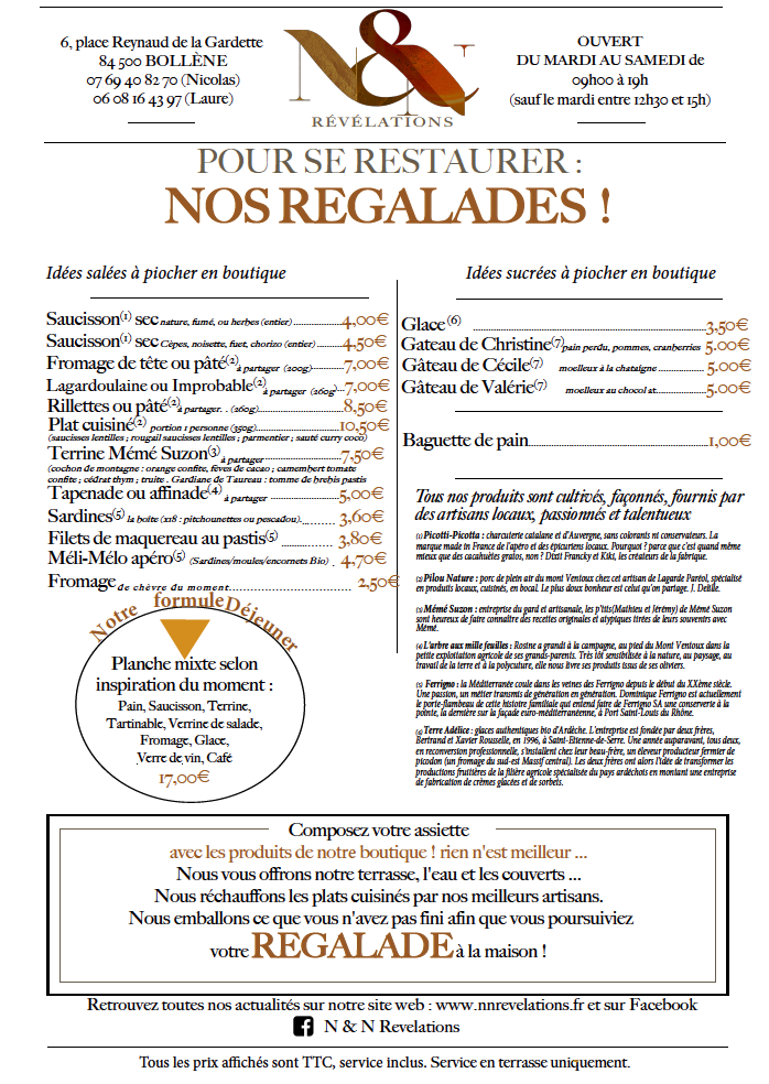 Bonjour à tous vous êtes de Bollène ou seulement de passage et vous aimez les bonnes choses alors vous êtes au bon endroit Révélation Épicerie fine et devenu un incontournable de Bollène vous serez chaleureusement accueilli par Nicolas le gérant et son coéquipier Dorian tout 2 passionné, un endroit réconfortant et une terrasse ttes agréable vous y attendent.Ici un seul mot d'ordre le délice des papilles, toutes les occasions sont bonnes pour y venir boire un bon vin entres amis, déguster un délicieux chocolat gourmand ou café torréfié par le gérant Nicolas lui même , ou vous laissé tenter par leur excellent croc tous aussi bon les uns que les autres une nouveauté une pépite que j'ai pu testé en privée et validé à 1000%. merci à vous pour votre générosité c'est toujours un plaisir à chacune de mes visites à bientôt
