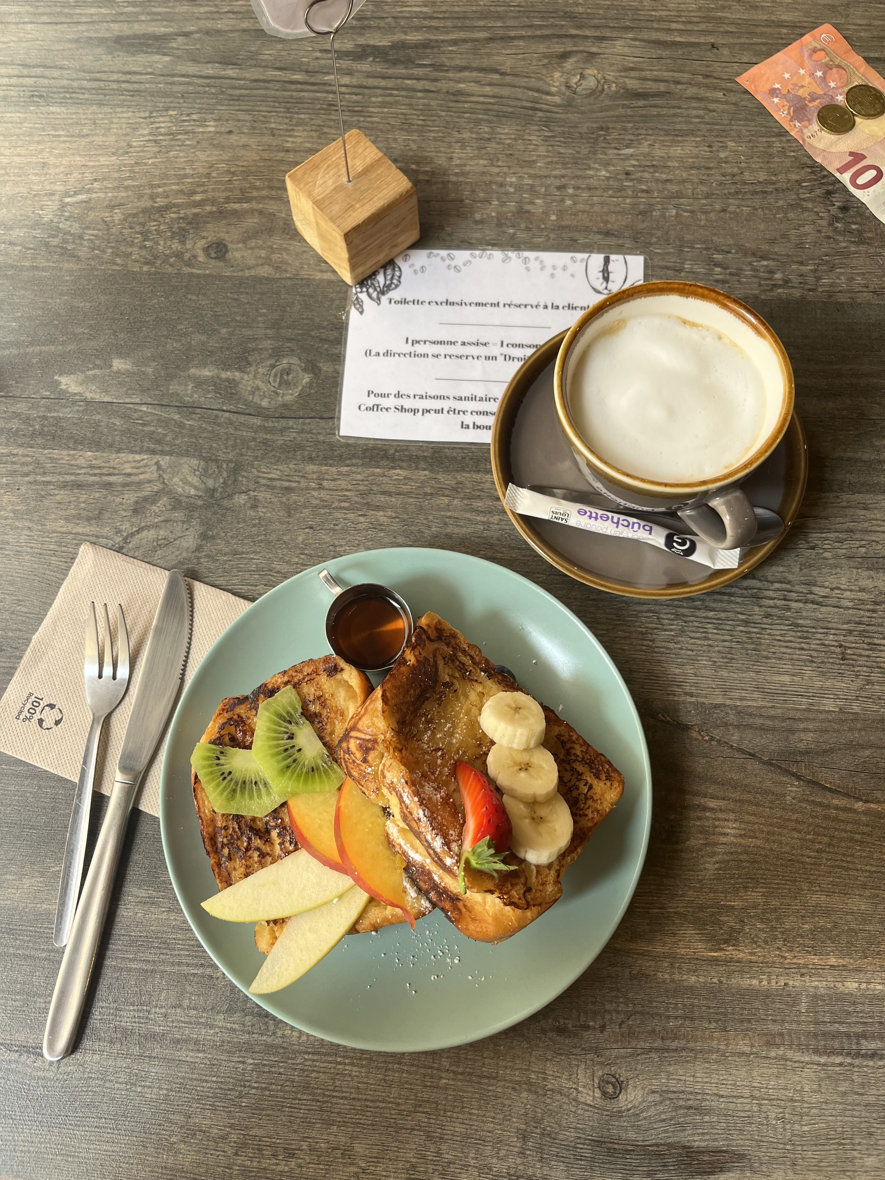 "Bon brunch bien servi. Très bon café. Continuez comme cela !"