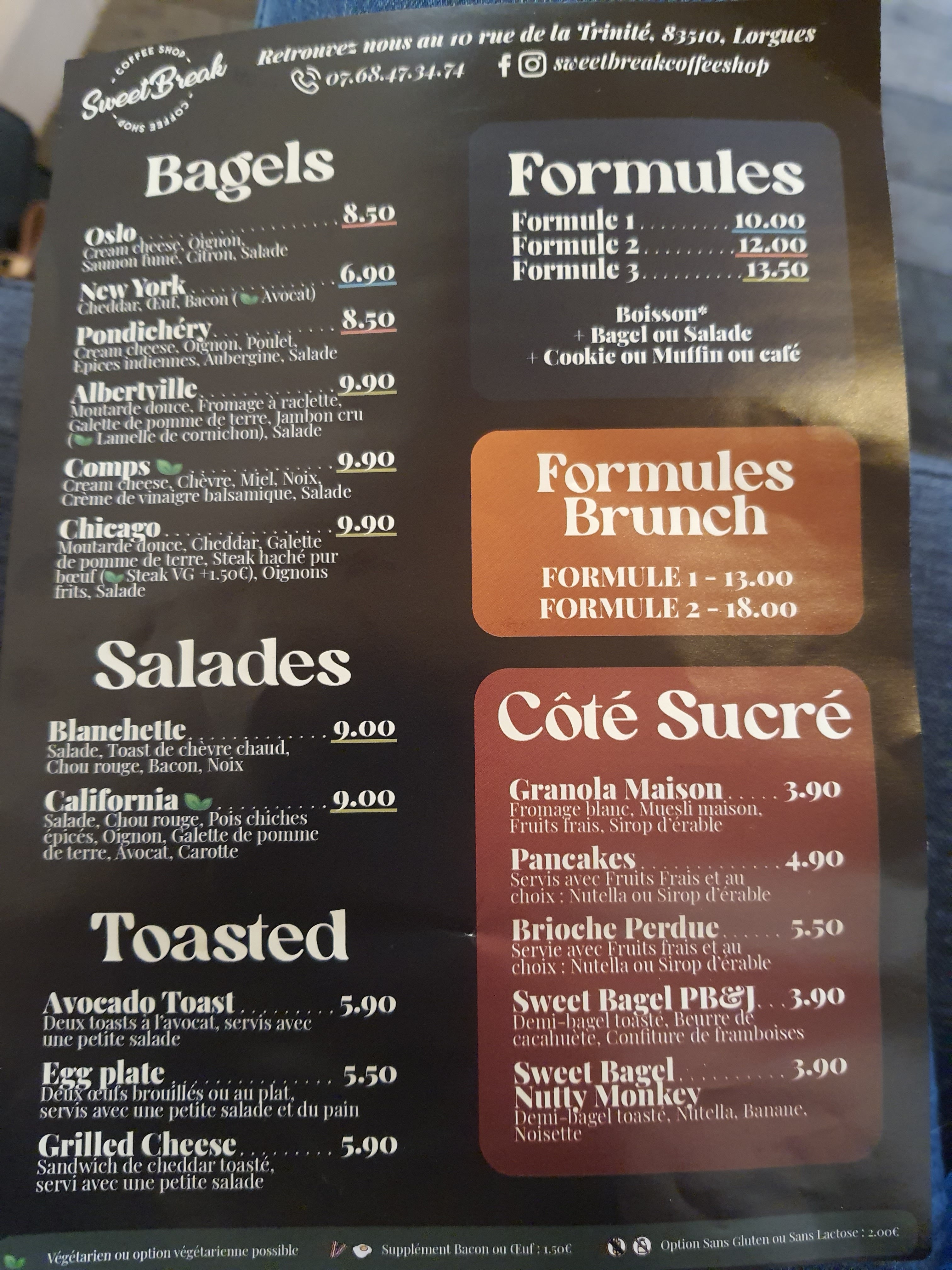 De passages à lorgues on ne savait pas où manger nous nous sommes arrêté chez sweet break Coffee Shop très bonne accueil salade et baggle très bon assiettes garni personnel très accueillant nous vous le recommandons encore merci à votre équipe