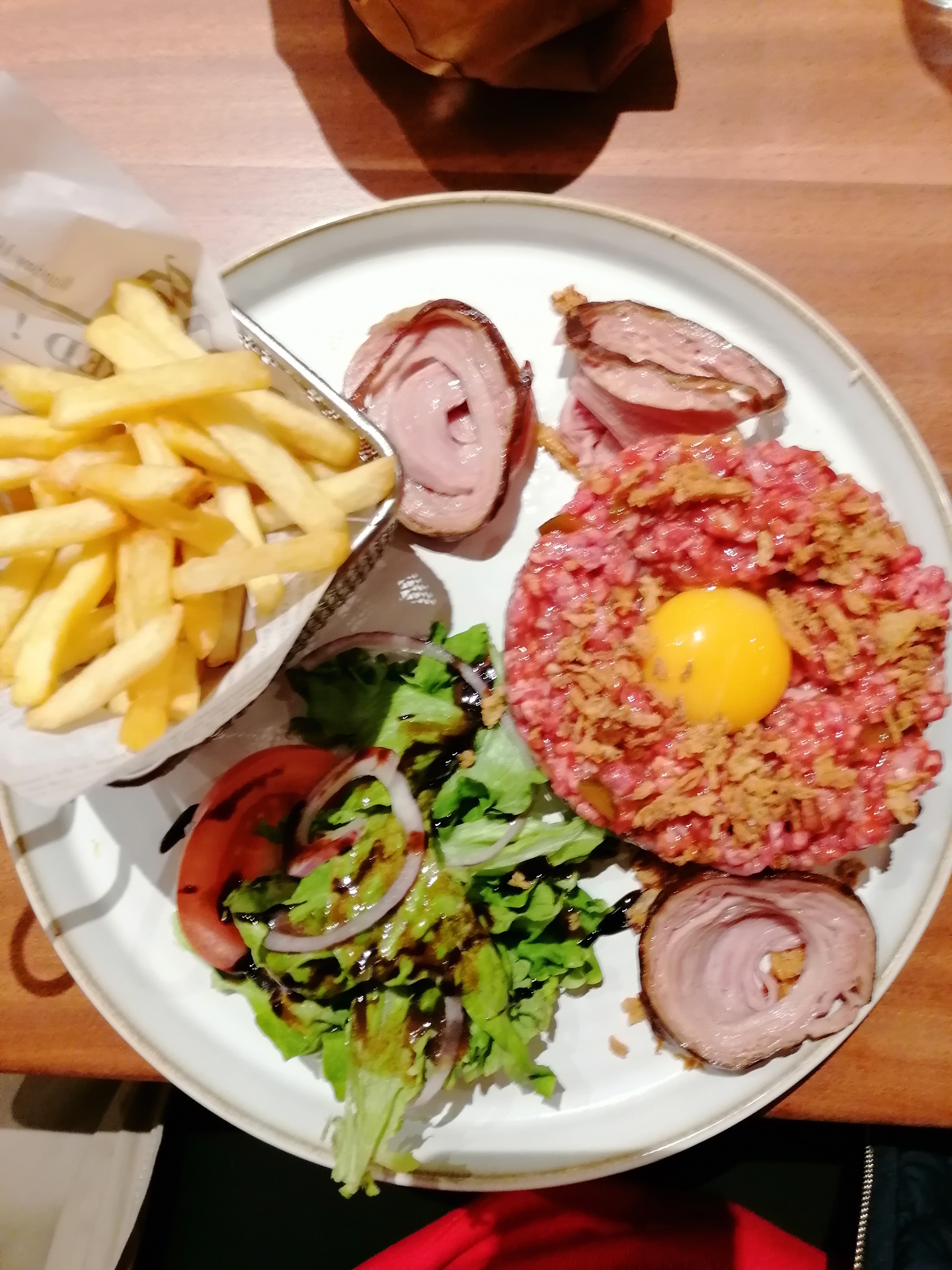 Dîner qui avait bien débuté car très bon accueil, la serveuse est très sympathique, l’ambiance du restaurant est très bonne, mais malheureusement les plats ne nous ont pas convaincu, la côte de bœuf contenait beaucoup de gras pour un prix qui reste élevé, les frites n’étaient pas terribles. Cela dit, les goûts et les couleurs se discutent donc à vous de vous faire votre propre opinion !