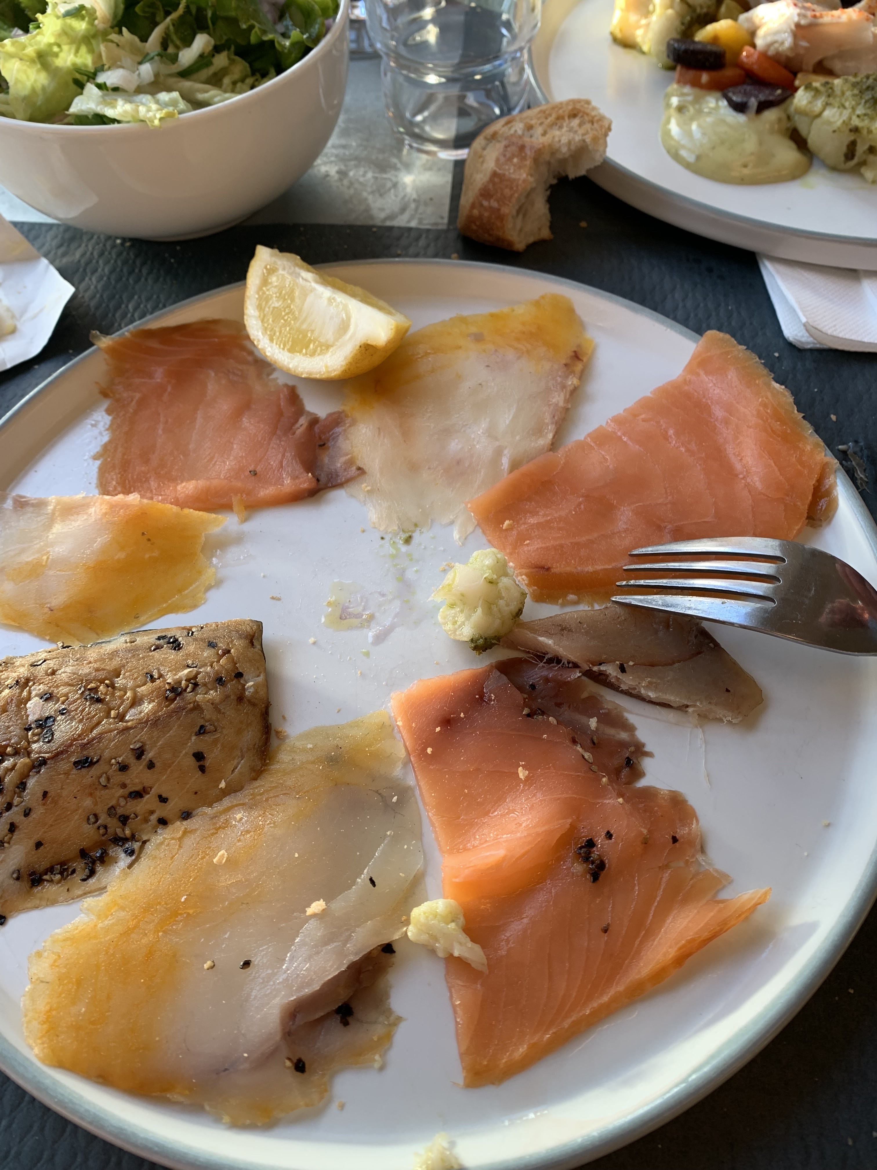 "Plats très bon : carpaccio lieu jaune , puis filet de bar !"